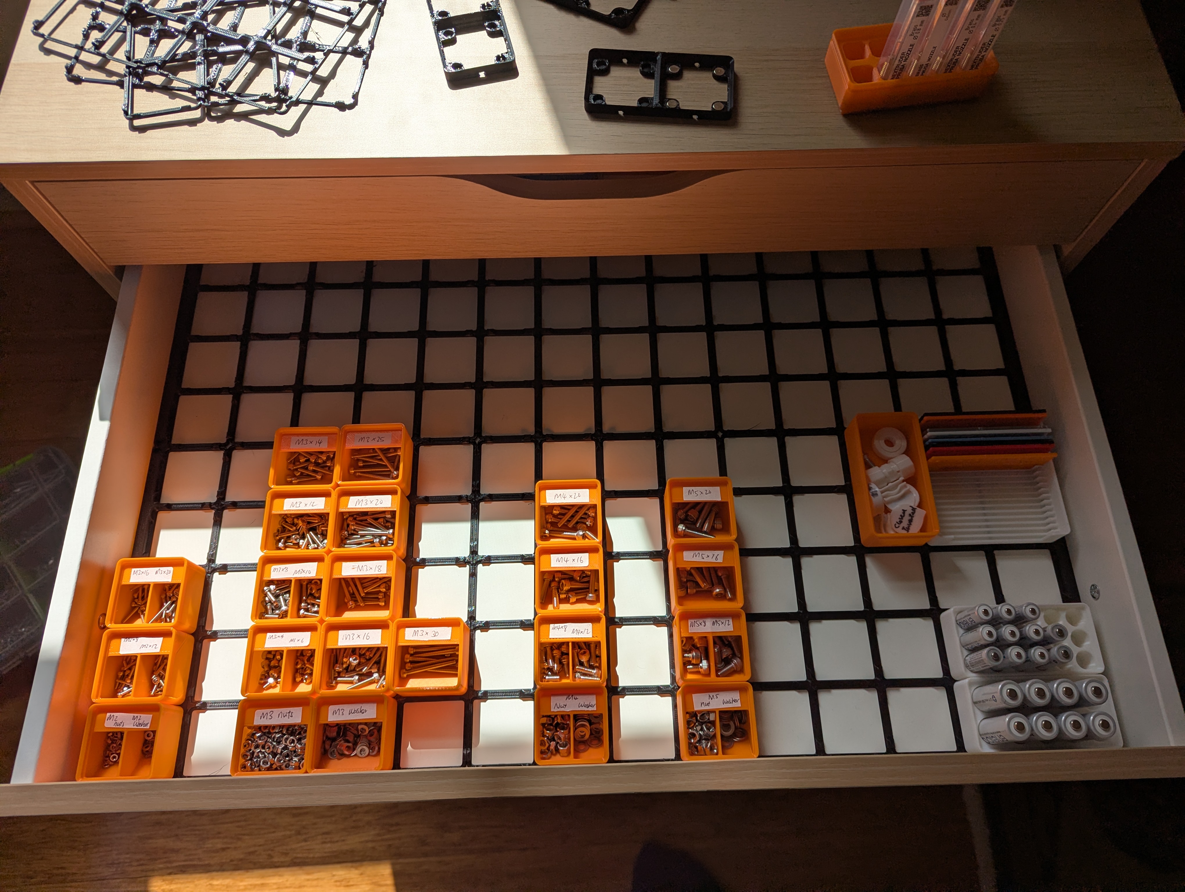 Đây là bản mình triển khai Gridfinity grid cho ngăn kéo IKEA ALEX bản rộng, tạo bằng generator của Perplexing Labs. Thành của các plate chỉ cao 1.2mm vì không cần chịu lực, đồng thời để tiết kiệm filament.