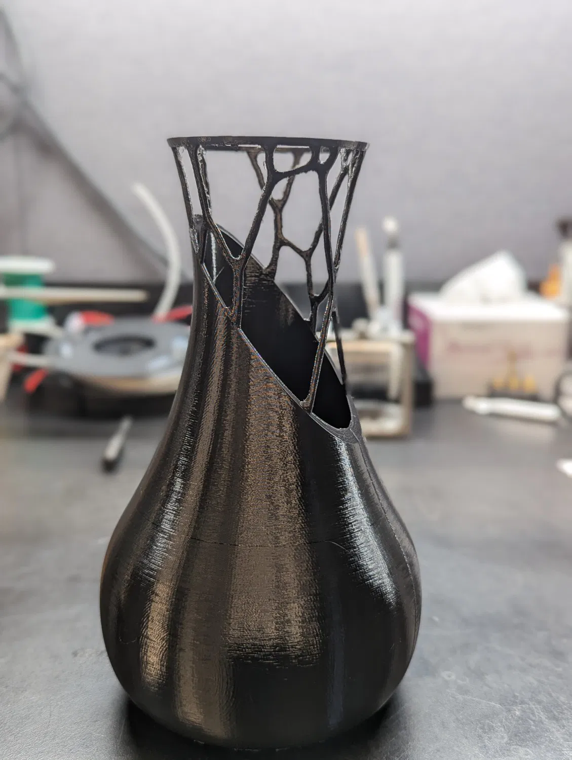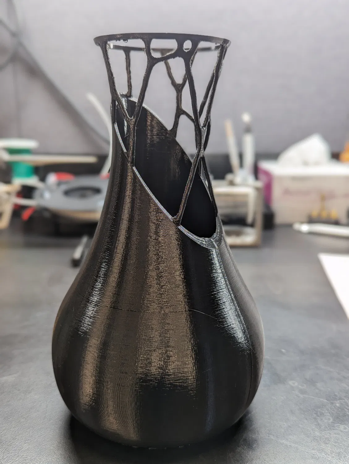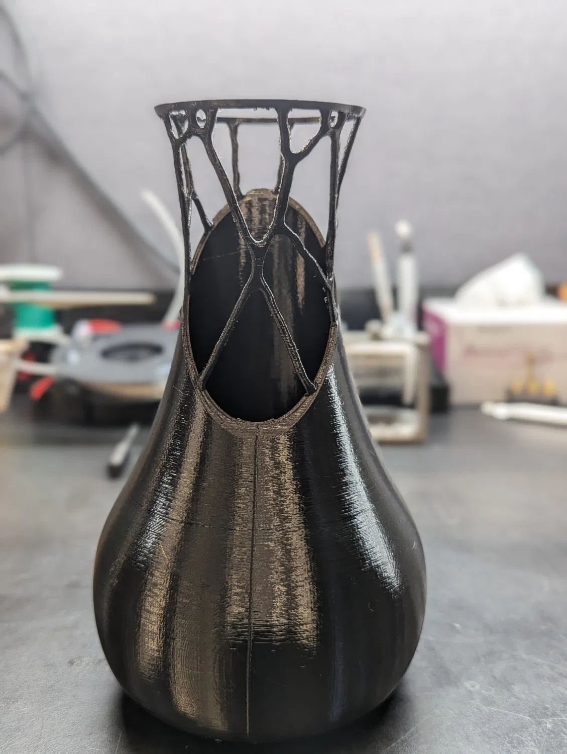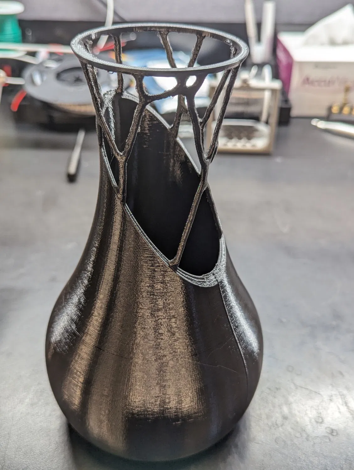 Mô hình được tạo trong Fusion 360 bằng thiết kế tổng quát để phát triển các hỗ trợ cho nửa trên của chiếc bình. Tôi đã in với các hỗ trợ hữu cơ để không có bất kỳ giao diện nào giữa mô hình và các hỗ trợ khác ngoài nơi cần thiết. Chỉ thêm một vài phút để in theo cách đó và xử lý hậu kỳ là cực kỳ dễ dàng. Nếu không, họ in rỗng và sẽ dễ dàng phá vỡ.