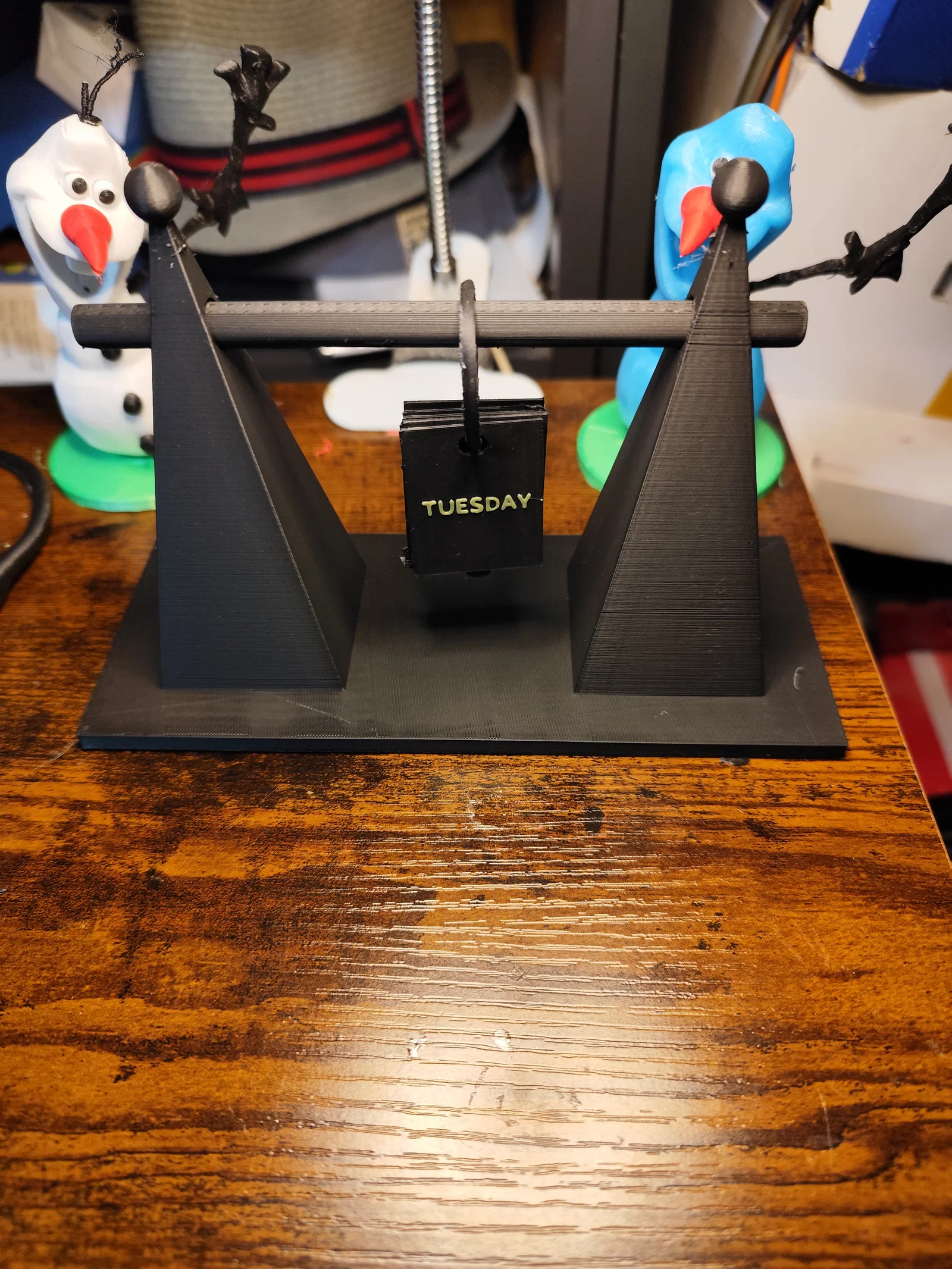 Mẫu “day calendar” giúp nhắc người lớn tuổi đã uống thuốc trong ngày hay chưa, tránh uống lặp dẫn tới quá liều. Gồm vòng (ring) và các viên (tiles); cần cắt chéo vòng để lắp, và đổi filament ở lớp cuối để chữ nổi bật.