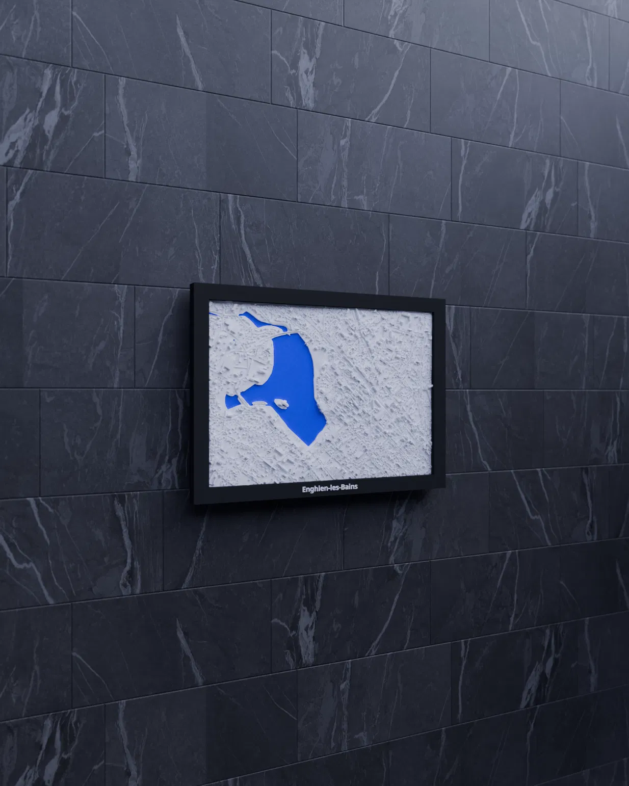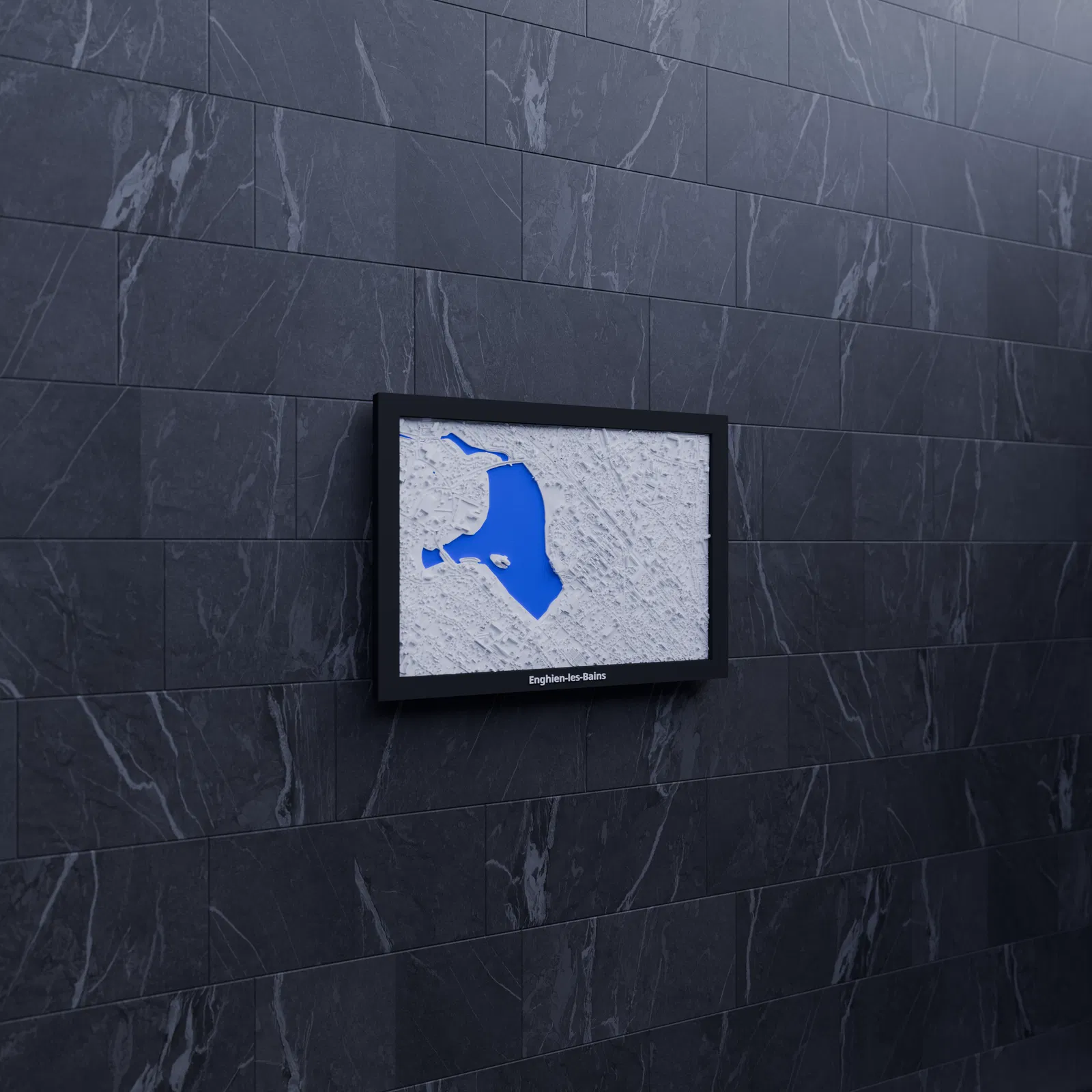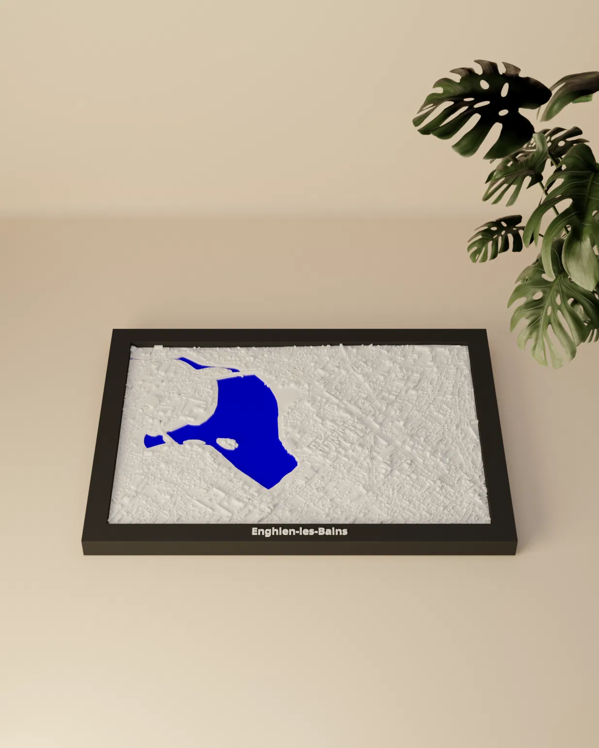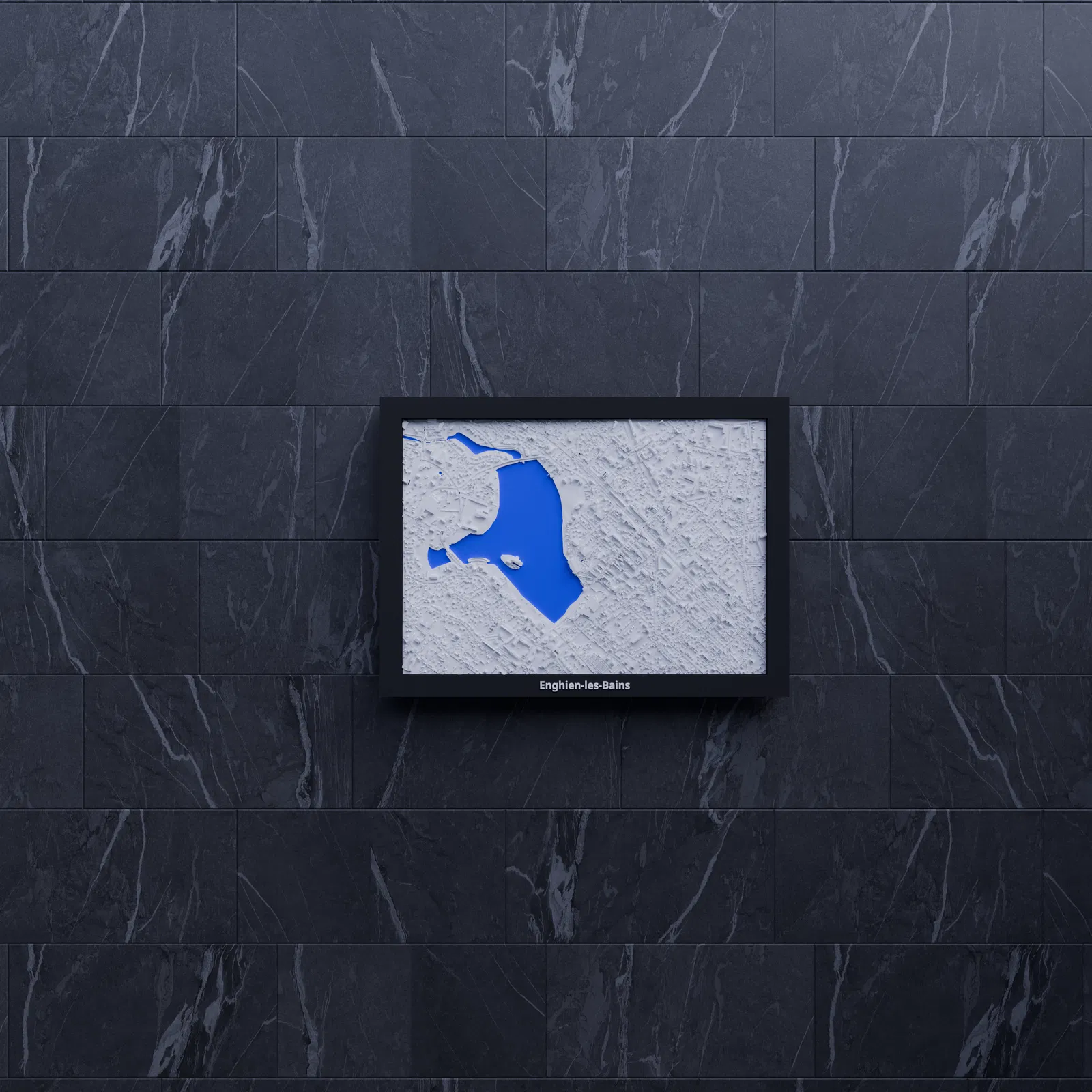 Mô hình địa hình thu nhỏ 3D của Enghien-les-Bains (Pháp), dựng từ dữ liệu địa lý để tái hiện terrain chân thực. Kèm nhiều lựa chọn frame, có lỗ treo, phù hợp trưng bày, học tập hoặc làm quà.