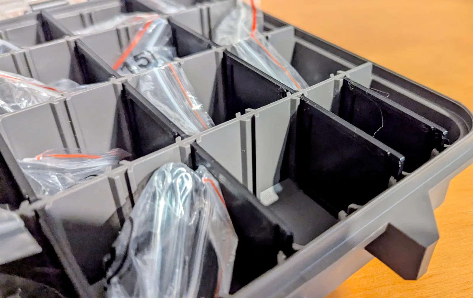 Bộ vách ngăn in 3D dành cho hộp dụng cụ Plano StowAway 3700, thiết kế có góc đáy vát (chamfer) để lắp gọn hơn. Kích thước mỗi vách: 1.8" x 1.6" x 0.94".