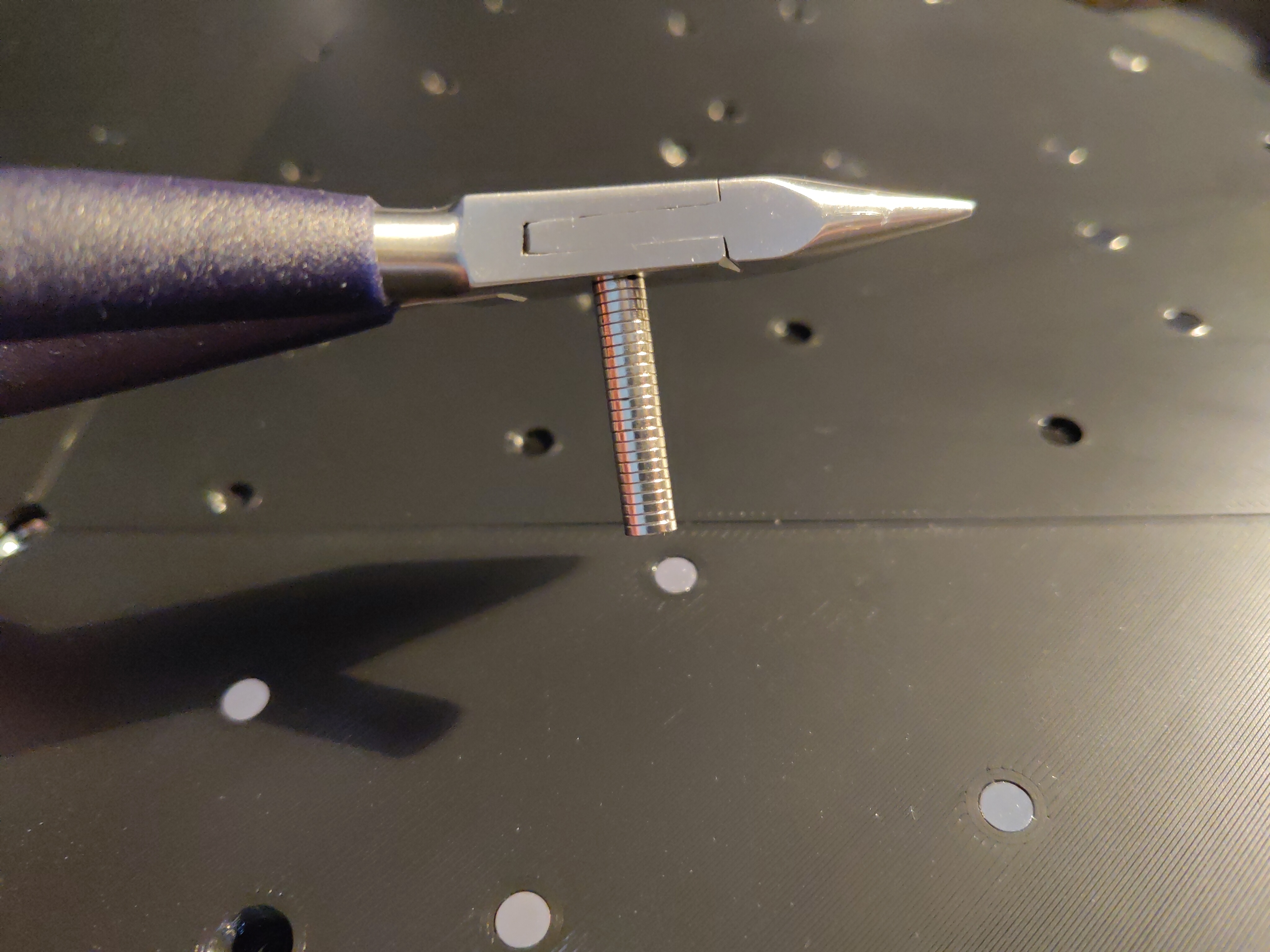 Cách dễ nhất để ép 120 nam châm vào các lỗ là chồng vài viên nam châm lên trên một cái kềm và ép từng chút một từ chồng đó. Như vậy tất cả nam châm sẽ cùng chiều từ tính, rất tiện nếu bạn muốn dùng marker nam châm.
