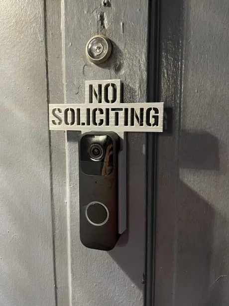 Đúng y như tên gọi: đây là một bảng No Soliciting đặt tựa lên phía trên Blink Doorbell.