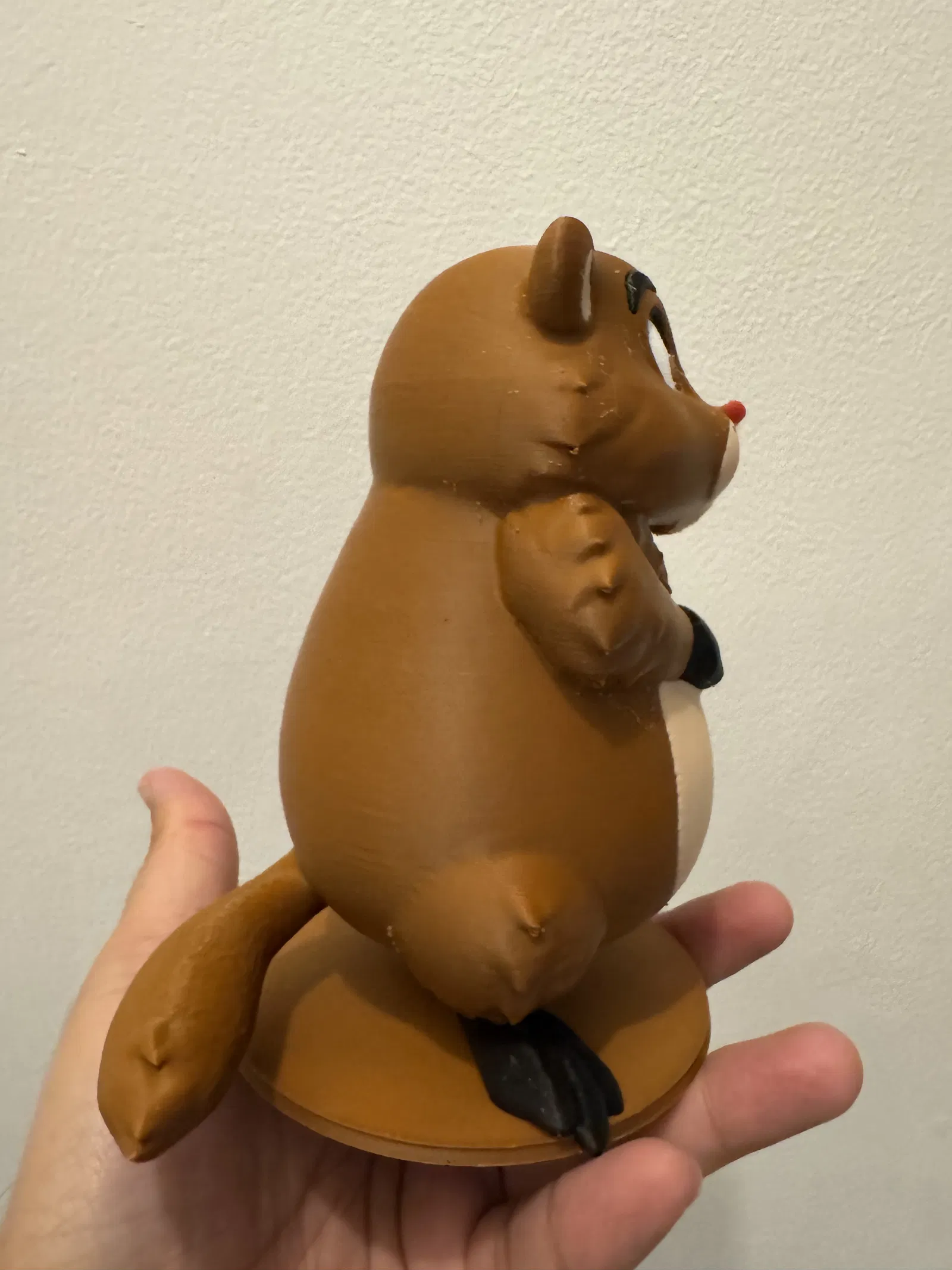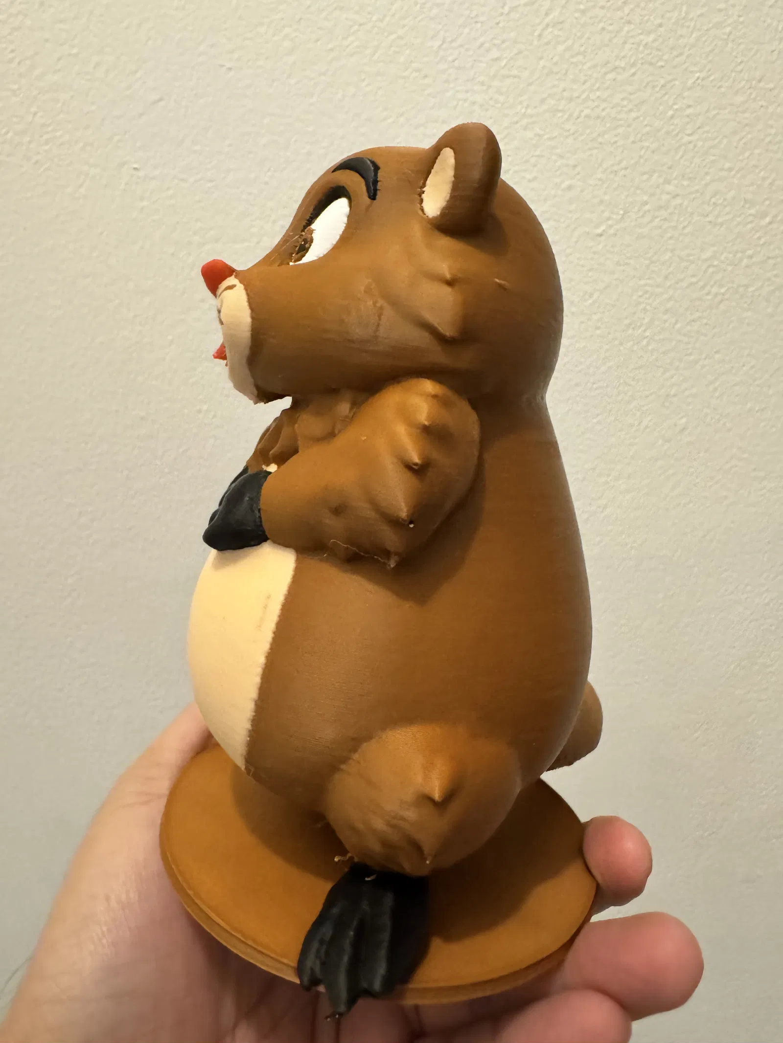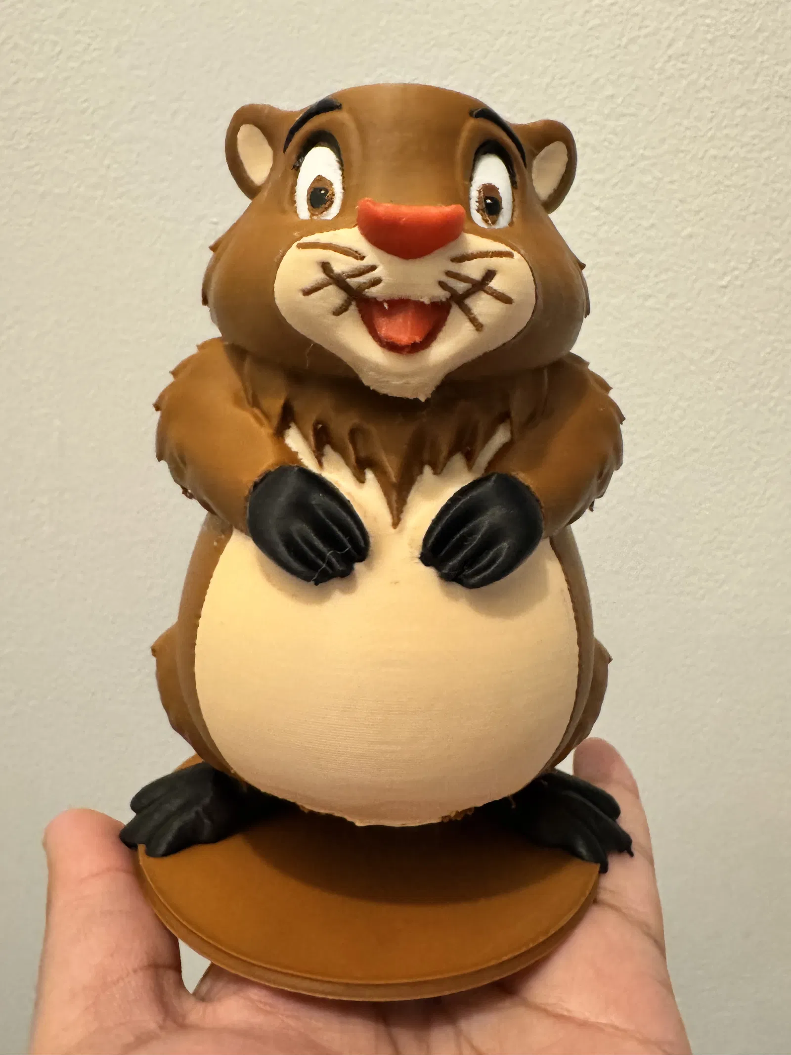 Mẫu figurine Groundhog (Marmota) gồm bản multicolor (3MF) và bản single color (STL). Bản nhiều màu cần 5 màu và AMS, in khoảng 40 giờ; bản một màu in khoảng 6 giờ, có thể tô thêm bằng acrylic markers.