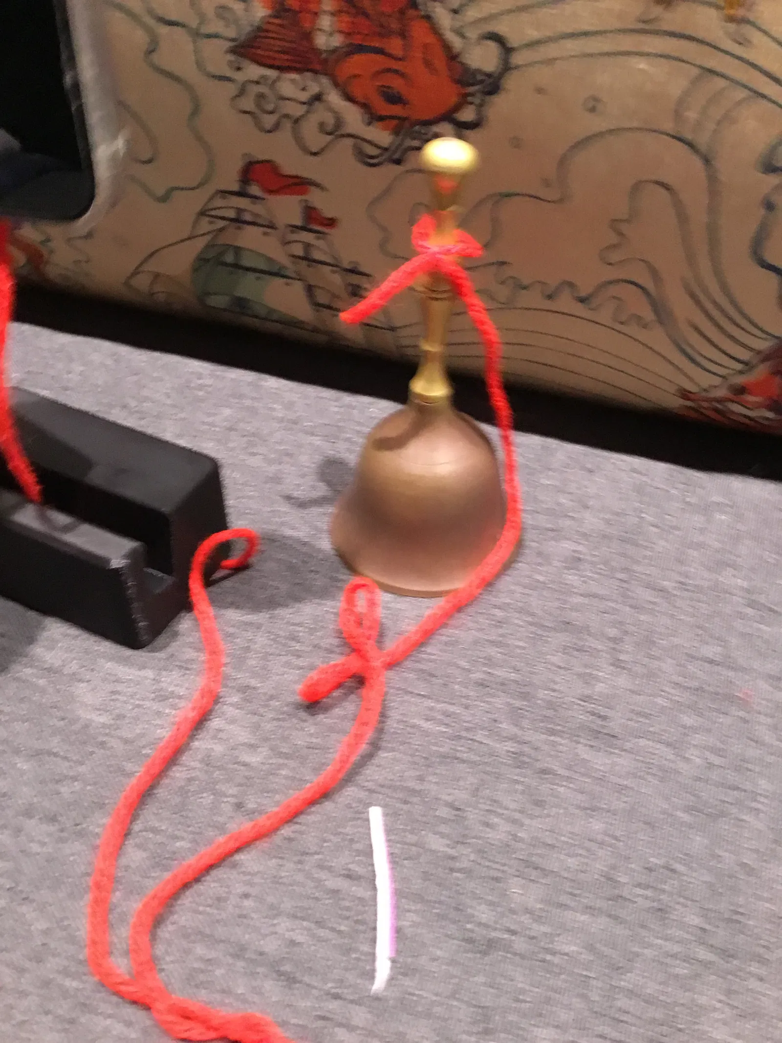 Đế đỡ điện thoại đơn giản cho iPhone 15 Pro. Phần đế có lỗ để luồn dây: một đầu buộc vào ốp lưng, đầu còn lại gắn chuông hoặc thiết bị phát tiếng để tạo hiệu ứng “báo động”.