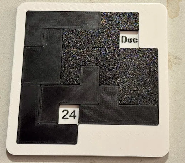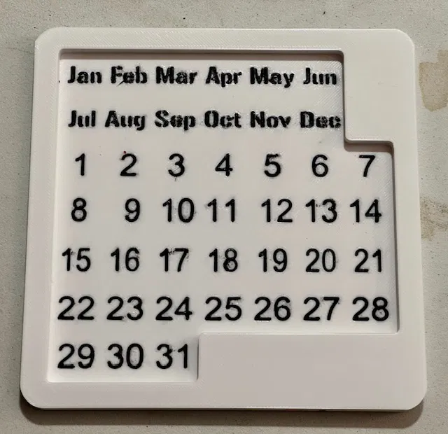 Bản remix Puzzle-a-day (Ceasar’s Calendar) với số/chữ lớn hơn để in đa màu dễ đọc, dễ canh màu. Model này tập trung hiển thị Month/Day, phù hợp in PETG/PLA và dùng kèm solver khi cần.