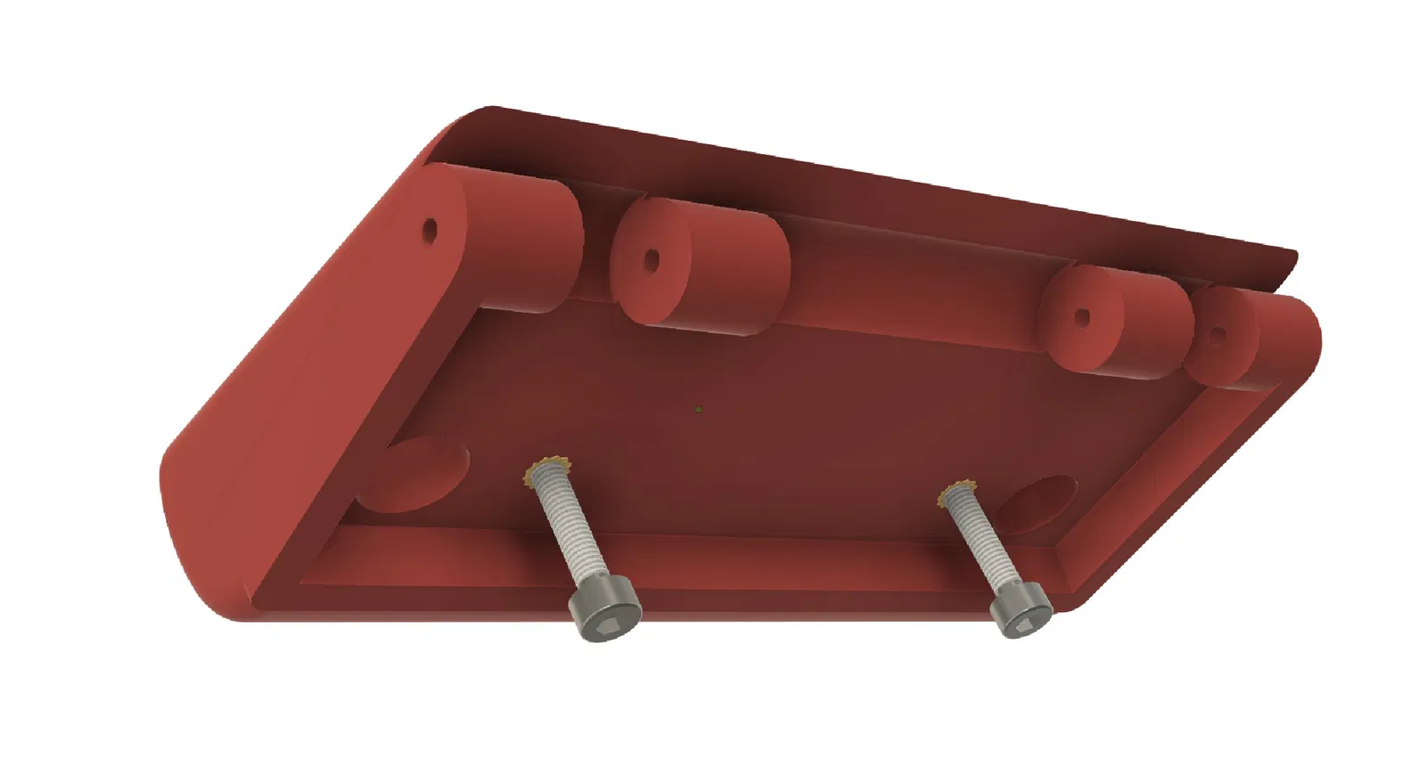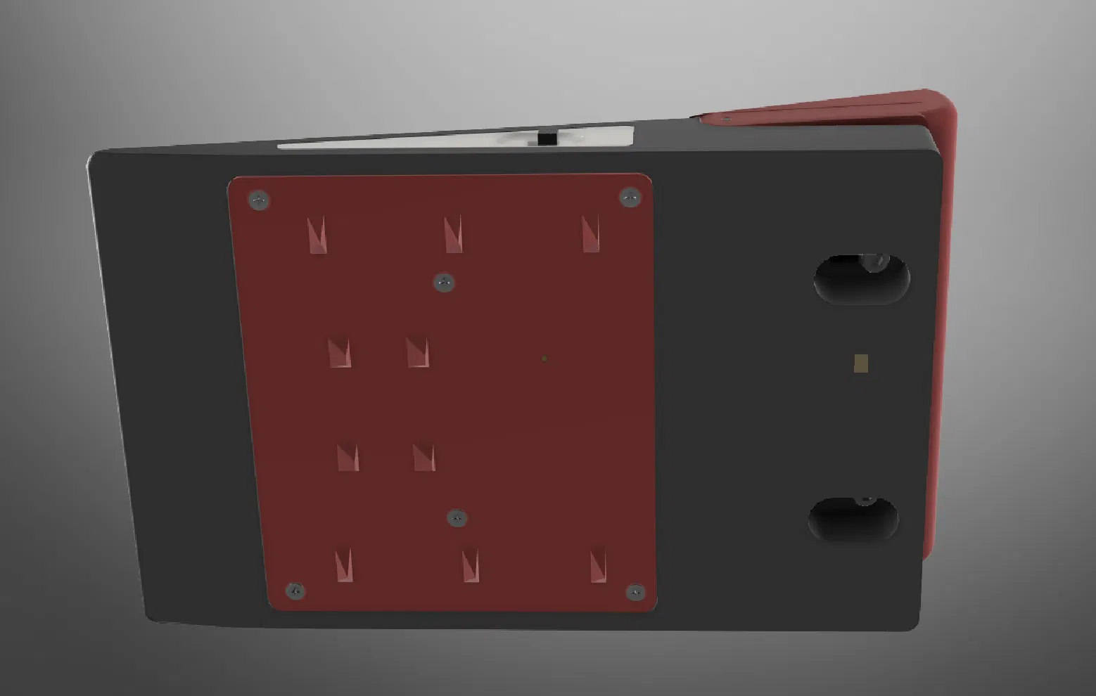 Tấm đáy có thể xoay 180 độ. (Một mặt có gai cho thảm, và một mặt không gai cho sàn phẳng.) Đừng để gai chọc vô pin (!!!!!). Các lỗ bắt vít được đặt lệch (asymetrical) để tránh lắp sai. Có thể sau này mình sẽ đổi tấm đáy sang kiểu kẹp một bên, và chỉ bắt vít một bên. Nhưng mình đang nhiều dự án quá, không có thời gian. Chia sẻ còn tốn thời gian hơn cả vẽ đồ...