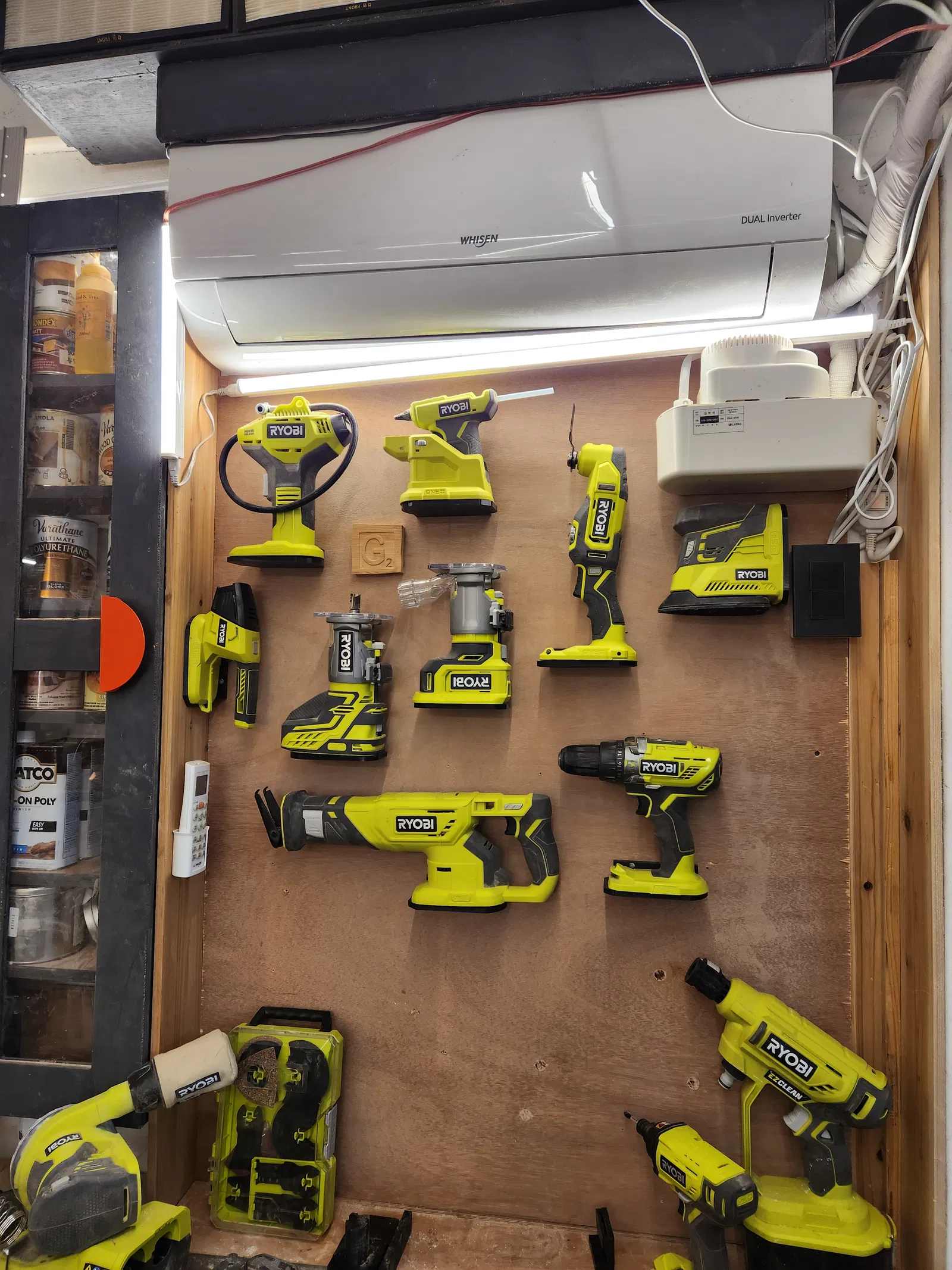 Mình đã tìm một thiết kế kệ/giá treo tường cho dụng cụ Ryobi One+ 18v. Những mẫu mình tìm được thì hay treo dụng cụ theo nhiều hướng khác nhau.