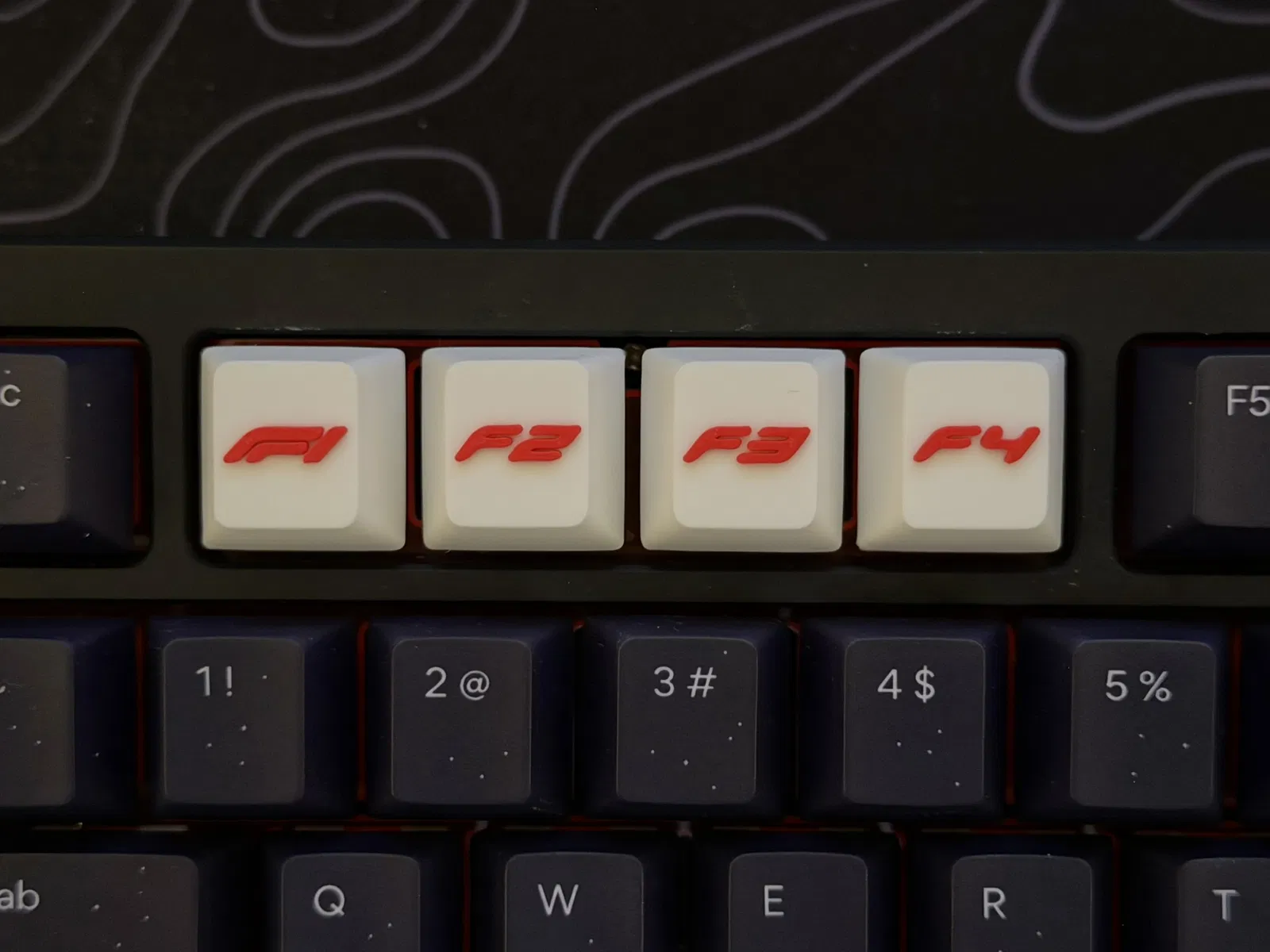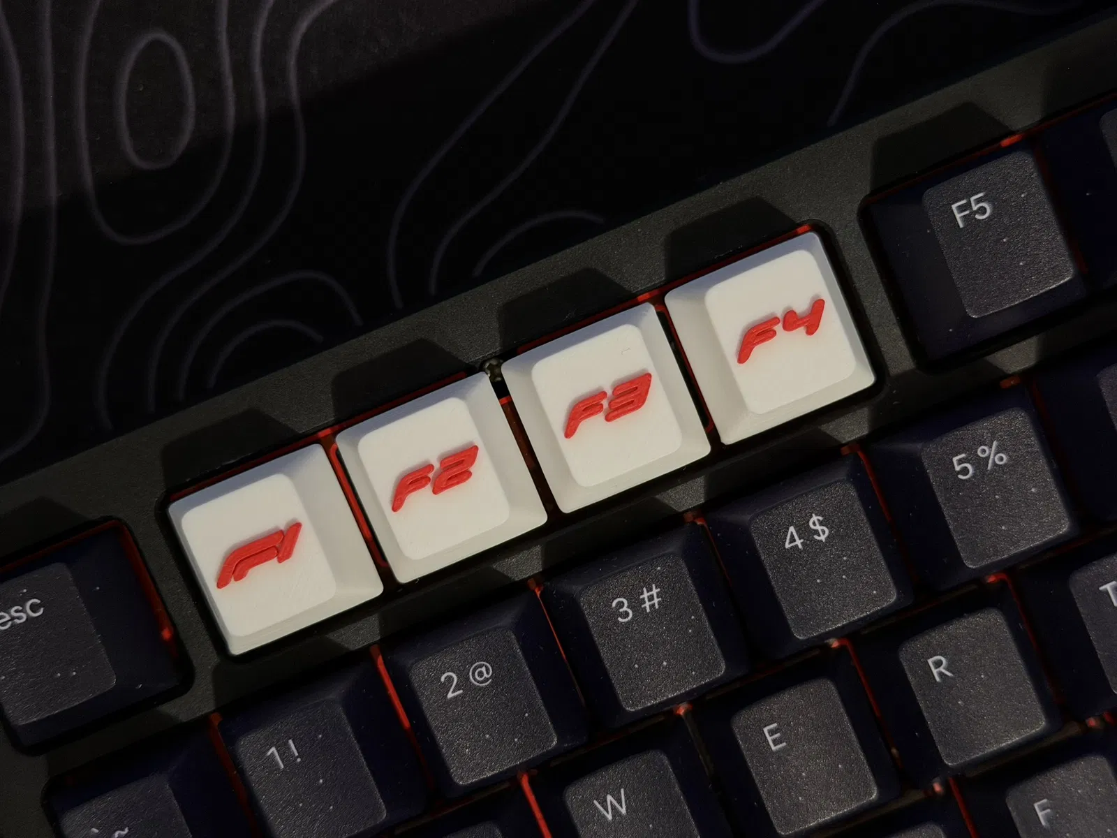 Bộ 4 keycap Formula in logo F1–F4, thiết kế theo profile Cherry MX R4 (hàng trên). Phù hợp để tuỳ biến phím ESC, function row hoặc macro keys. In nhanh dưới 30 phút, tốn tổng dưới 10g filament.
