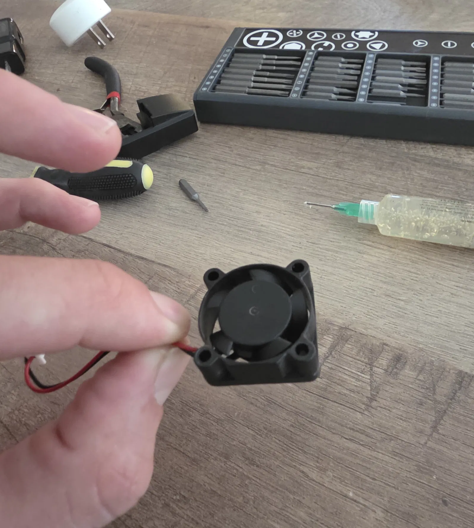 Bạn sẽ không cần mấy con ốc đặc biệt nào khác ngoài mấy con ốc để cố định mấy cái quạt 5015. Tui dùng mấy con ốc lục giác đầu pan 2mm x ~15mm có long đền sẵn có, nhưng thật tình thì ốc gỗ cùng kích cỡ cũng xài được thôi. Một số người làm mấy vụ này phức tạp như tên lửa với tab inserts và mấy thứ vớ vẩn khác. Bạn có thể cần 2 cái đai ốc 3mm cho cái bộ phận giữ quạt ở giữa, nhưng thật sự thì nó cũng tự nằm im nếu bản in đủ khít rồi.