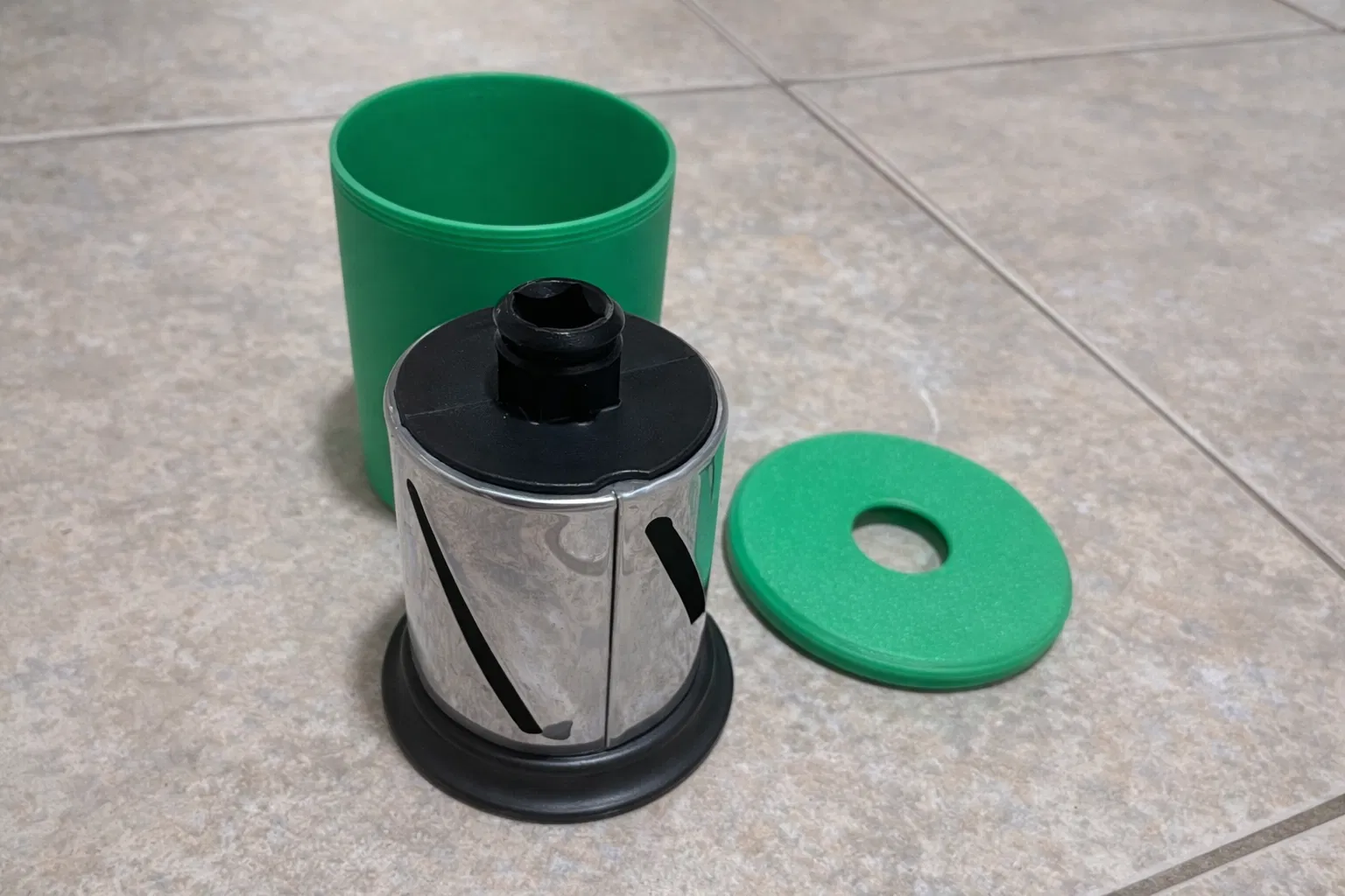 Grater Case là case in 3D dùng để chụp lên mép kim loại sắc của grater hình trụ khi cất, giúp hạn chế nguy cơ cứa tay. In không cần supports, mặt trong mượt ôm khít và có lỗ giữa để tháo nắp an toàn.