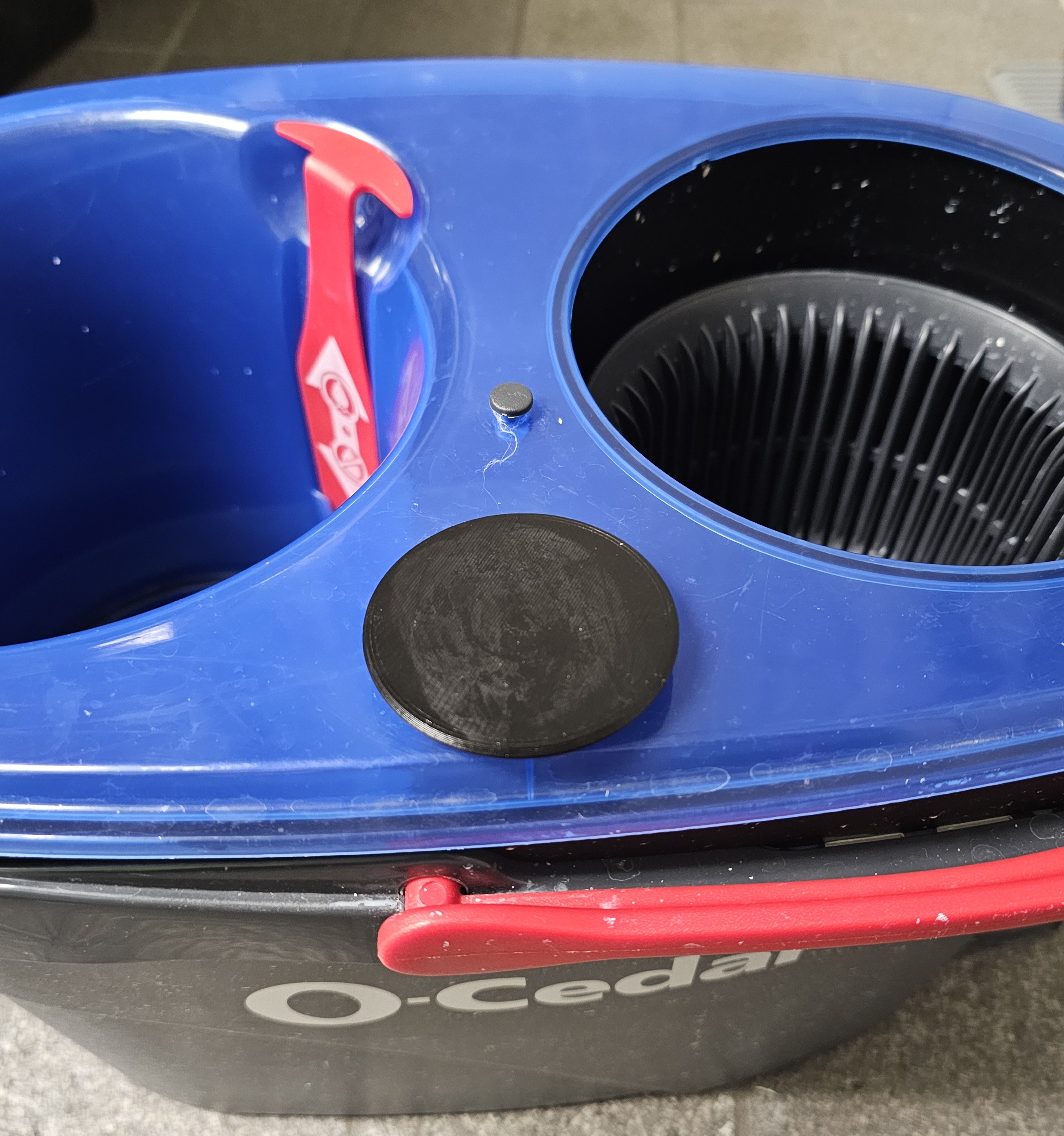 Nắp thay thế cho bình chứa nước sạch của xô O-Cedar Spin Mop, lắp ma sát (friction fit). Có kèm STL test dùng ít vật liệu để tinh chỉnh kích thước cho vừa khít; khuyến nghị PETG vì PLA dễ giòn khi hút nước.