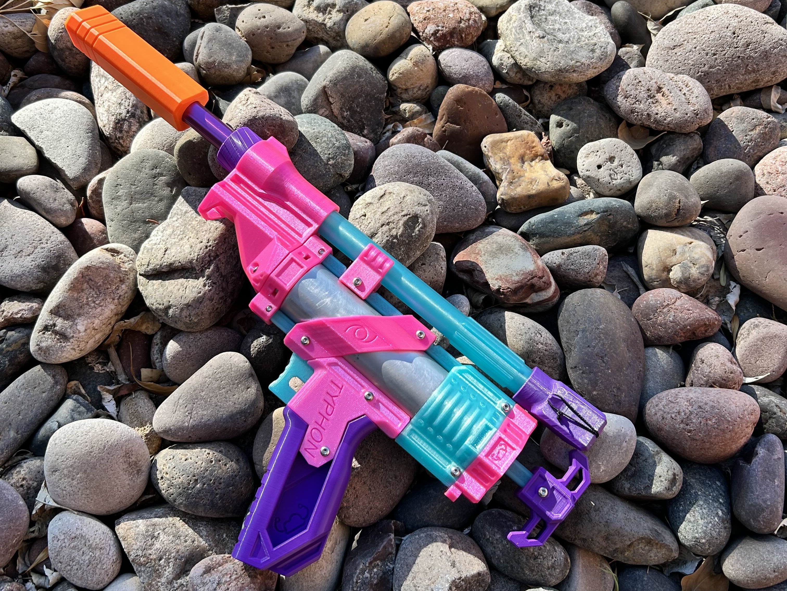 Typhon là blaster “Rainbow Pistol” dạng modular với T-Pull springer, draw 70mm, dễ in (400–600g filament) và thay lò xo gần như không cần đồ nghề. Hỗ trợ Silly Shell, Little Rocket, single shot và RSCB.
