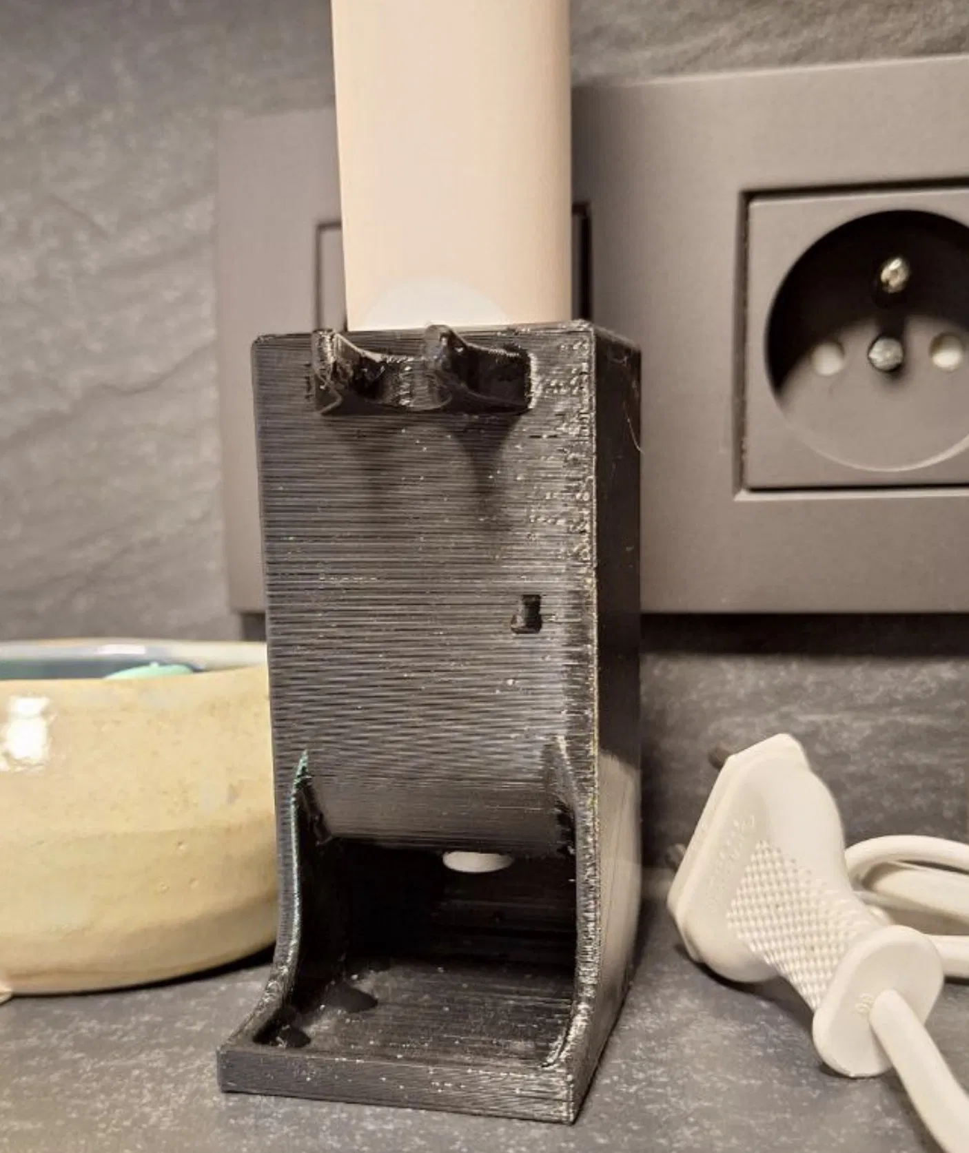 Kệ đỡ úp ngược cho OralB IO giúp nước/ẩm còn lại nhỏ giọt ra ngoài. Có thêm móc phía trước để treo đầu bàn chải cho khô. Thiết kế lưng nghiêng cho phép in không cần supports (khuyên dùng một bên để đẹp hơn).