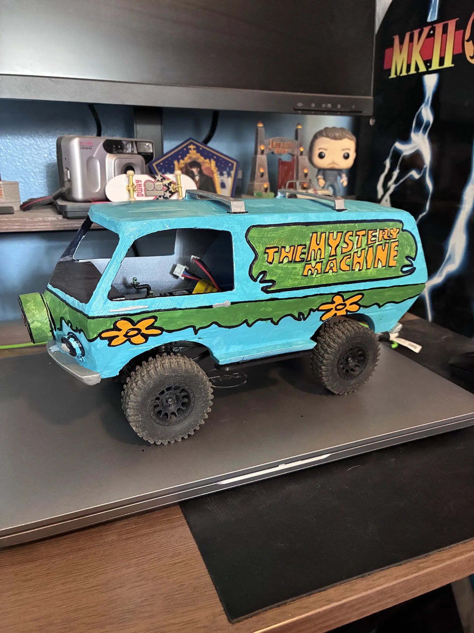 Mô hình Mystery Machine tỉ lệ 1:24 thiết kế vừa wheelbase & bề ngang chassis Axial SCX24 C10. In 10% infill, 4 walls nên cần nâng cấp shocks/springs và motor torque cao. In được 1 khối trên BambuLabs X1 Carbon, bắt buộc dùng supports.