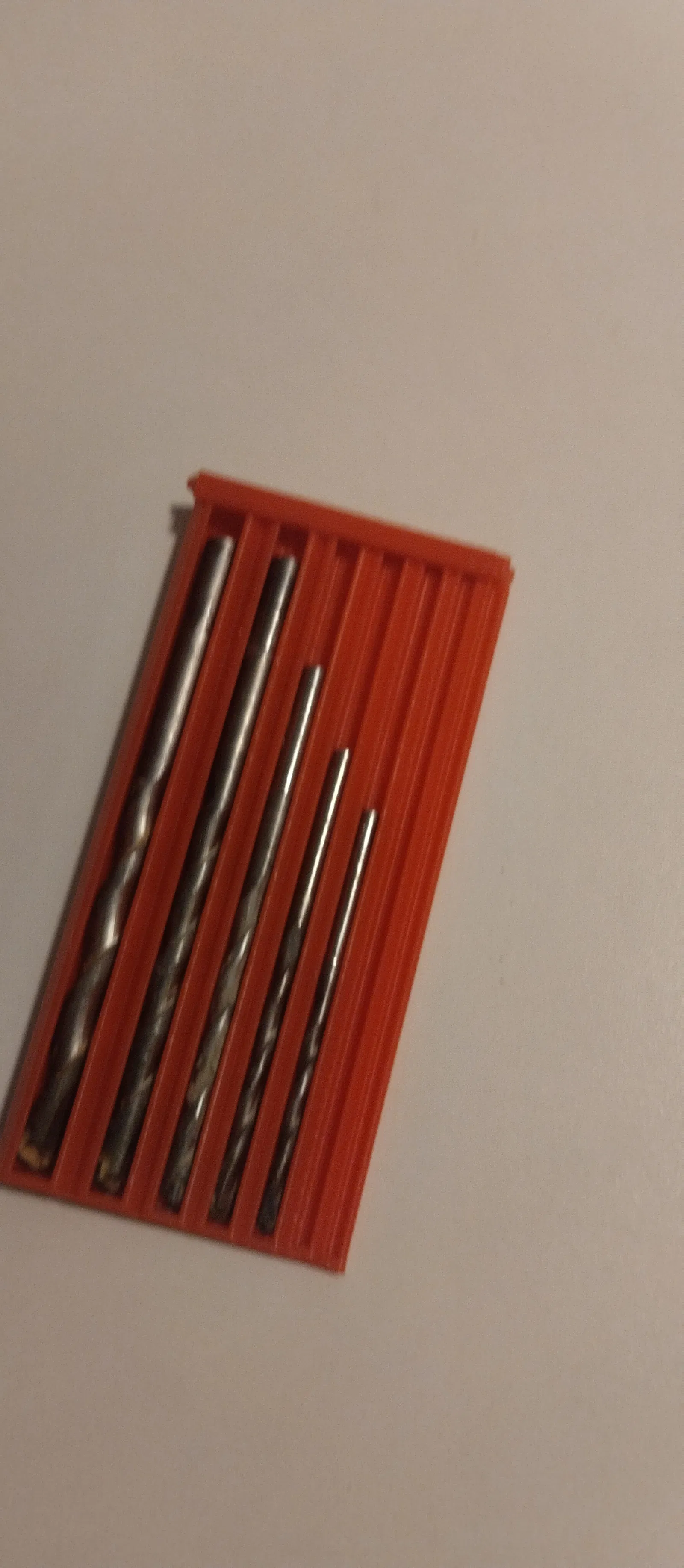Cái giá đỡ mũi khoan này có nắp đậy, nhưng nó cũng có thể giữ mũi khoan cố định bằng một sợi dây thun luồn qua rãnh của nắp. Như bạn thấy trong ảnh thì mũi khoan cũng được giữ cố định theo cách này. Với tui thì đây là một mẫu rất hữu ích. Tui không biết nó có "nguyên bản" tới mức nào.