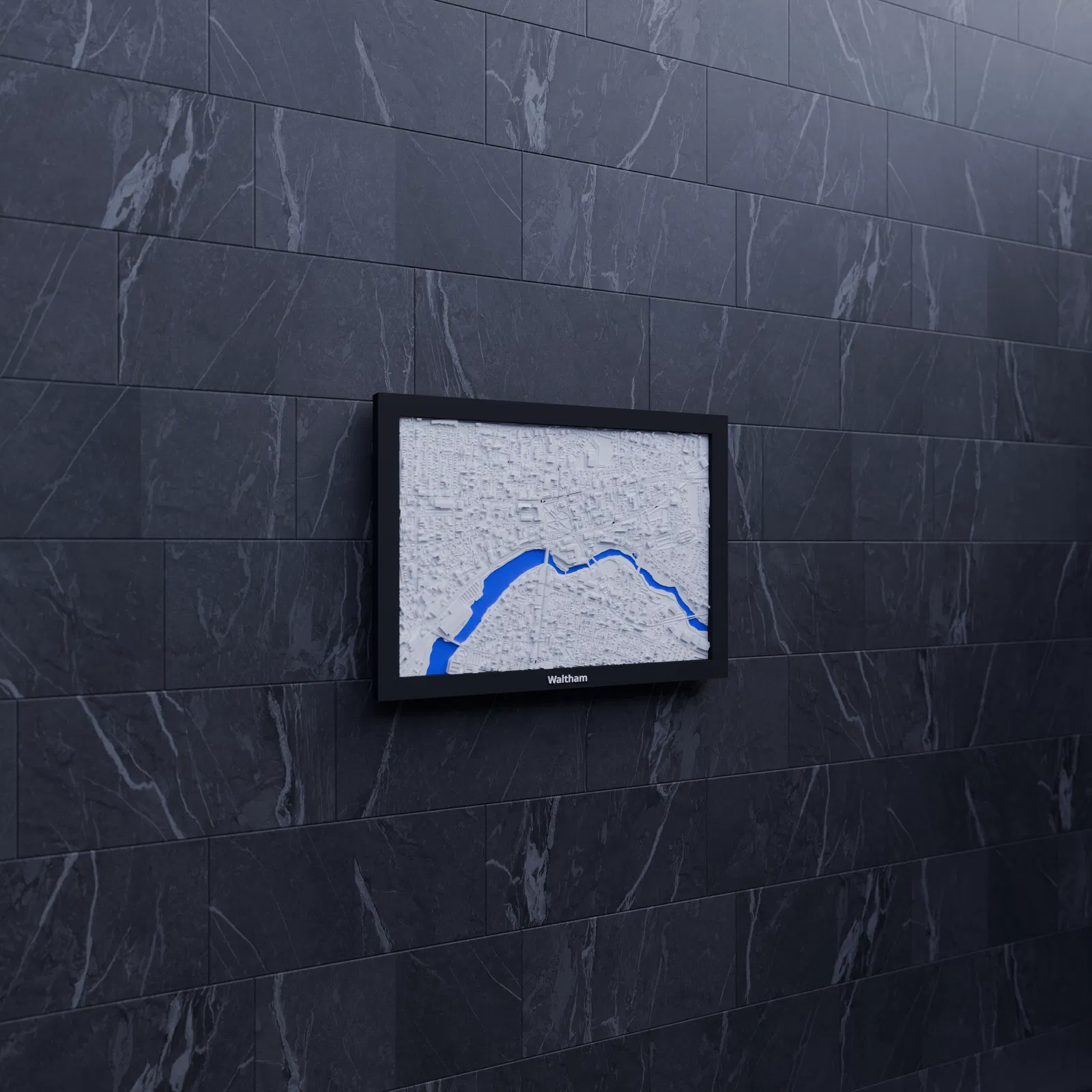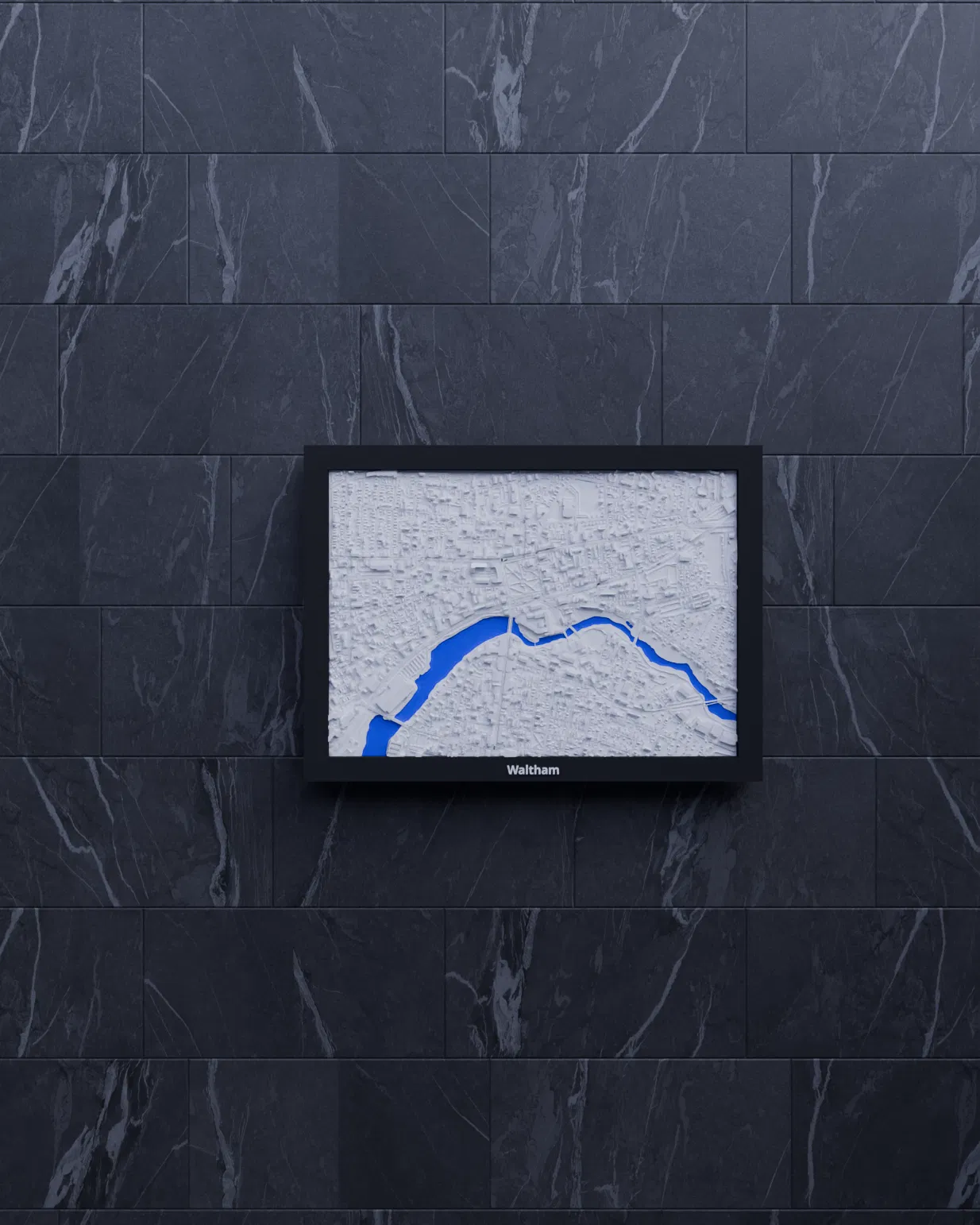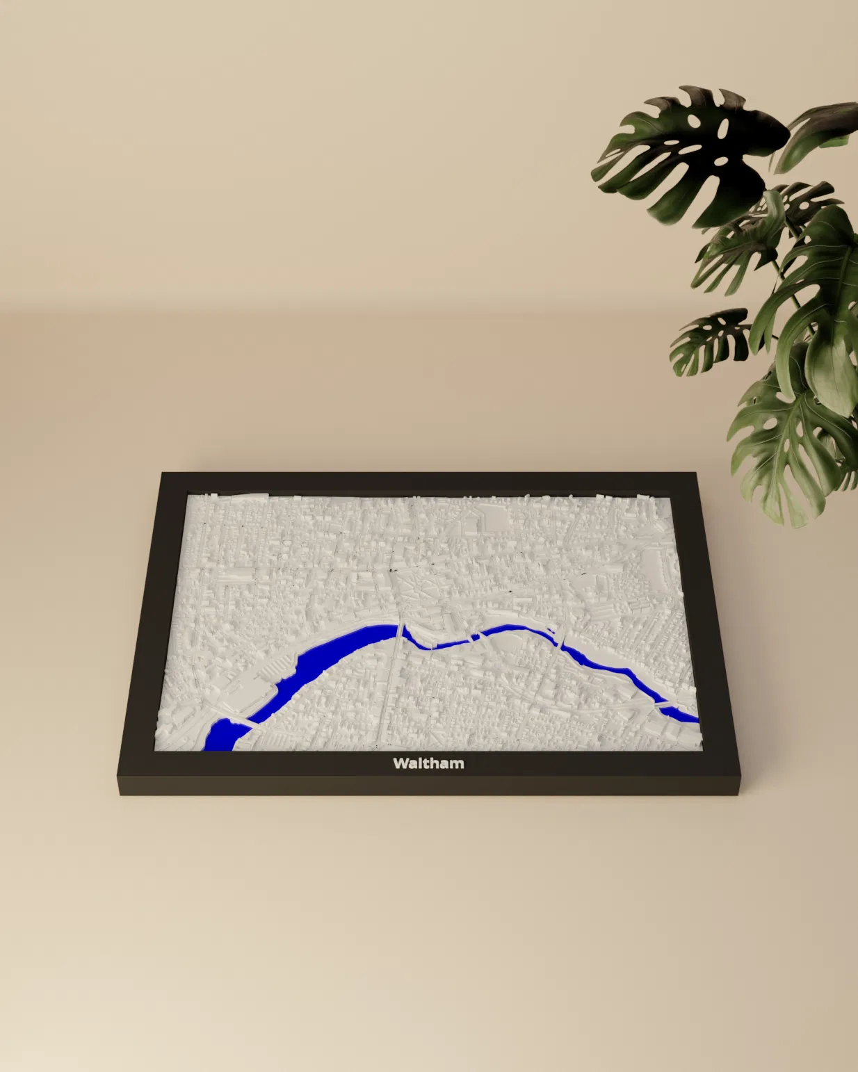 Mô hình địa hình thu nhỏ 3D của Waltham (Hoa Kỳ) dựng từ dữ liệu địa lý, thể hiện terrain chân thực. Thu nhỏ khu vực 2.049 x 1.431 km xuống 170.5 x 119.5 mm, kèm nhiều lựa chọn khung và print profile.