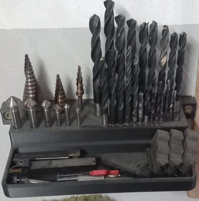 Giá treo tường (Bohrer-Halterung) dùng để sắp xếp gọn gàng mũi khoan, mũi vát (countersink) và mũi khoan bậc (step drill). Phù hợp để in 3D và lắp trong xưởng hoặc góc làm việc.