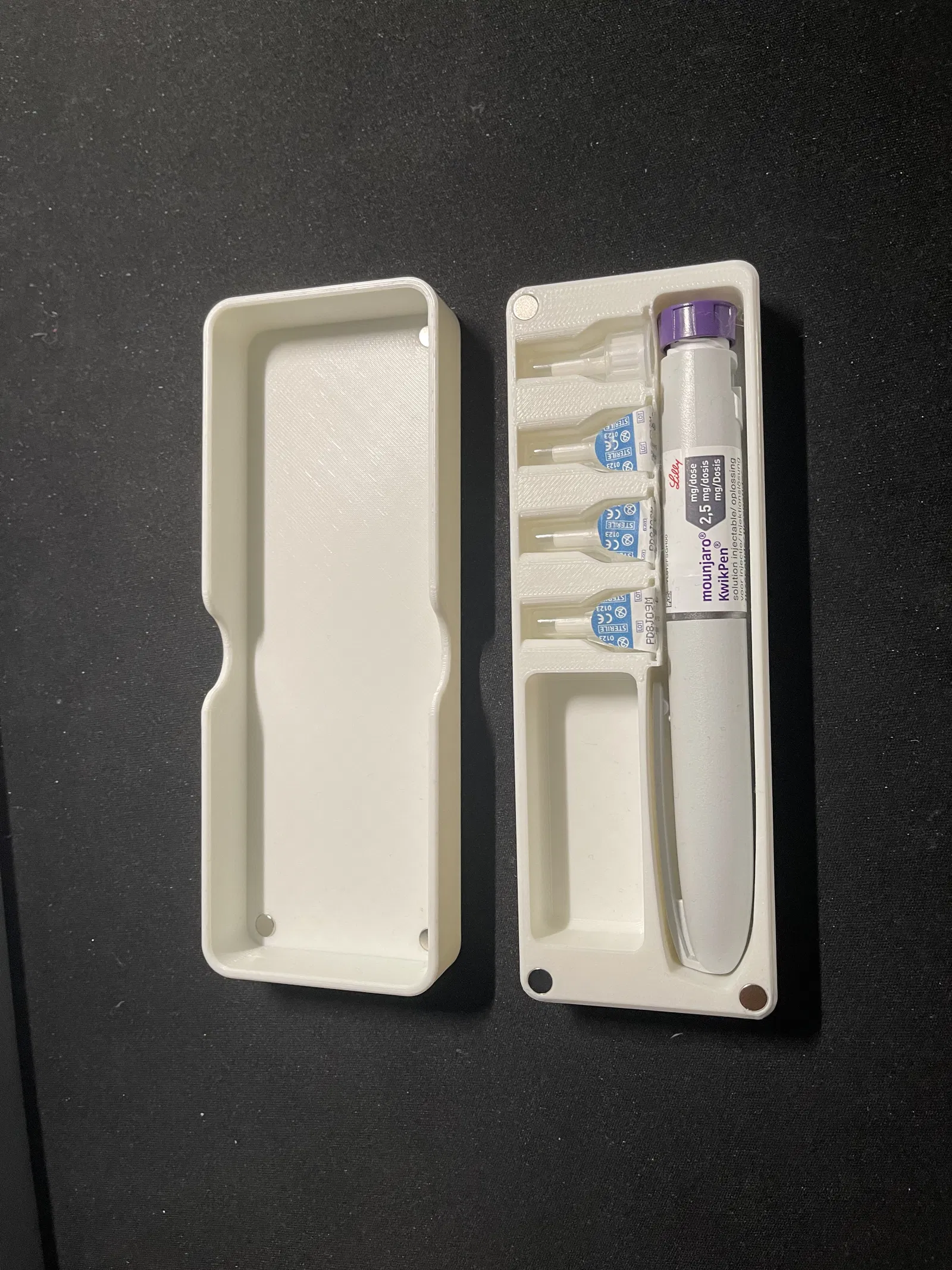 Hộp đựng nhỏ gọn cho 1 Mounjaro Kwikpen và 4 gói kim, tiện mang theo và bảo quản. Nắp hộp hít chặt nhờ 6 viên nam châm kích thước 6mm x 2mm.