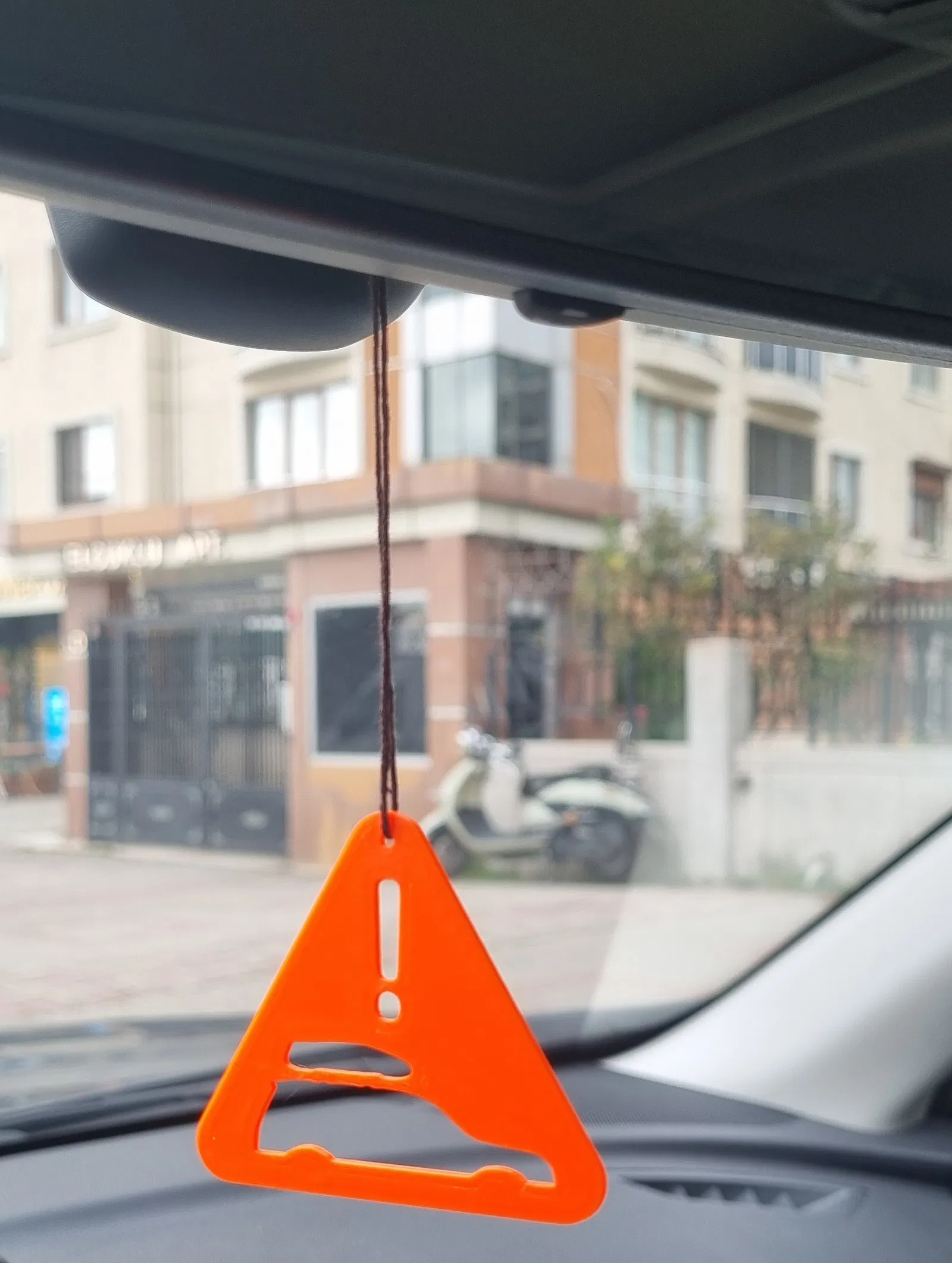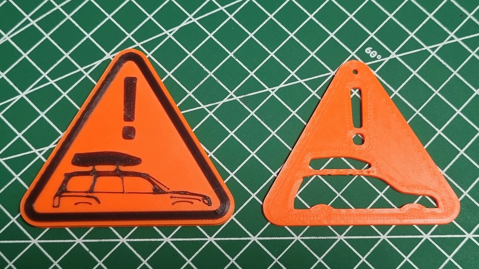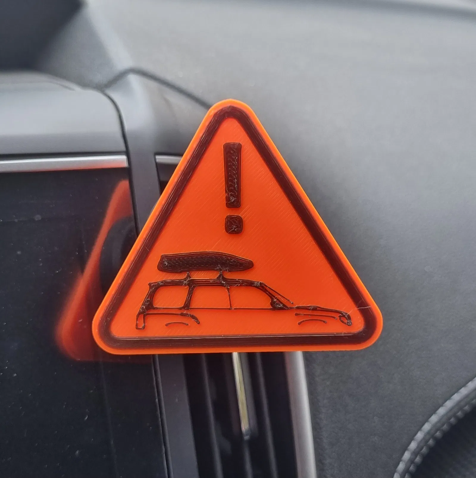 Phiên bản đầu là một tấm tam giác phẳng đơn giản, có dấu chấm than và silhoutte xe & roofbox được khoét rỗng. Dự tính để treo ở trụ/gọng gương chiếu hậu.