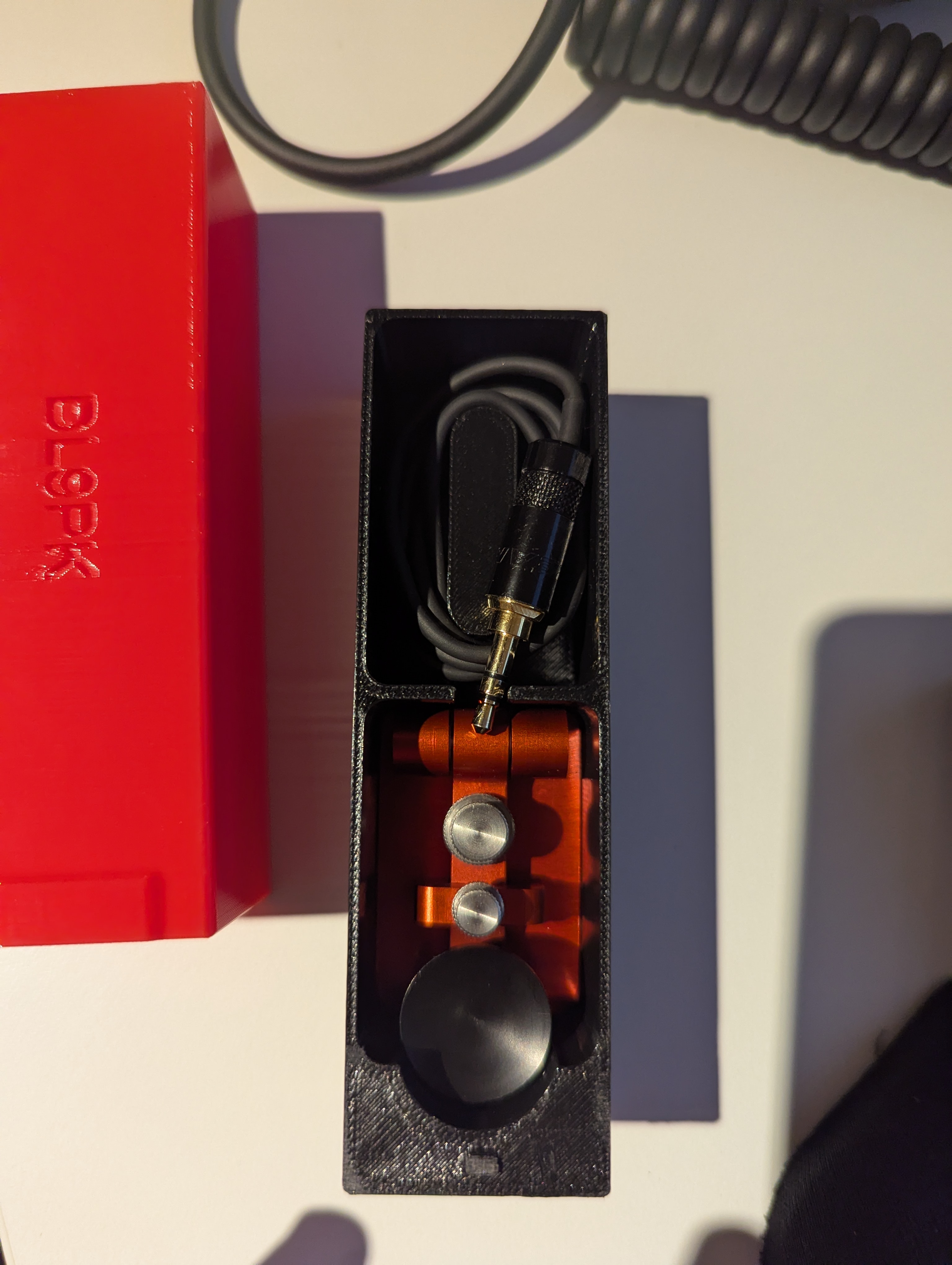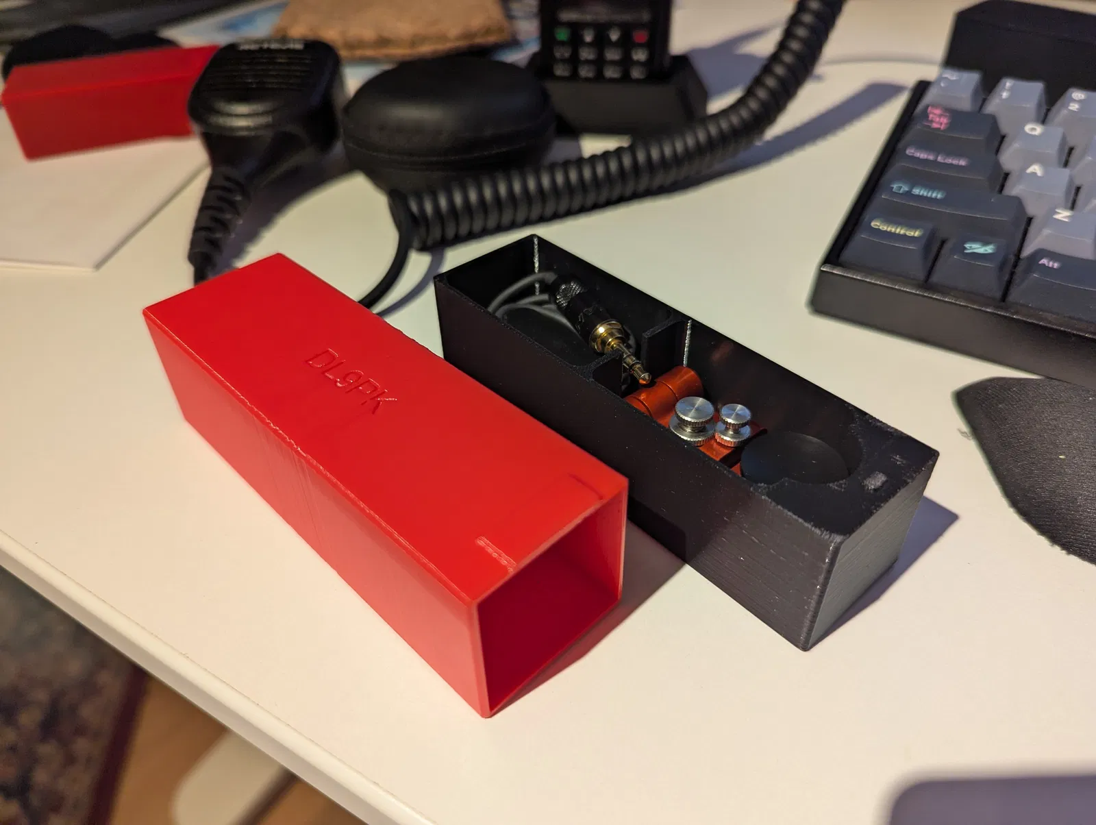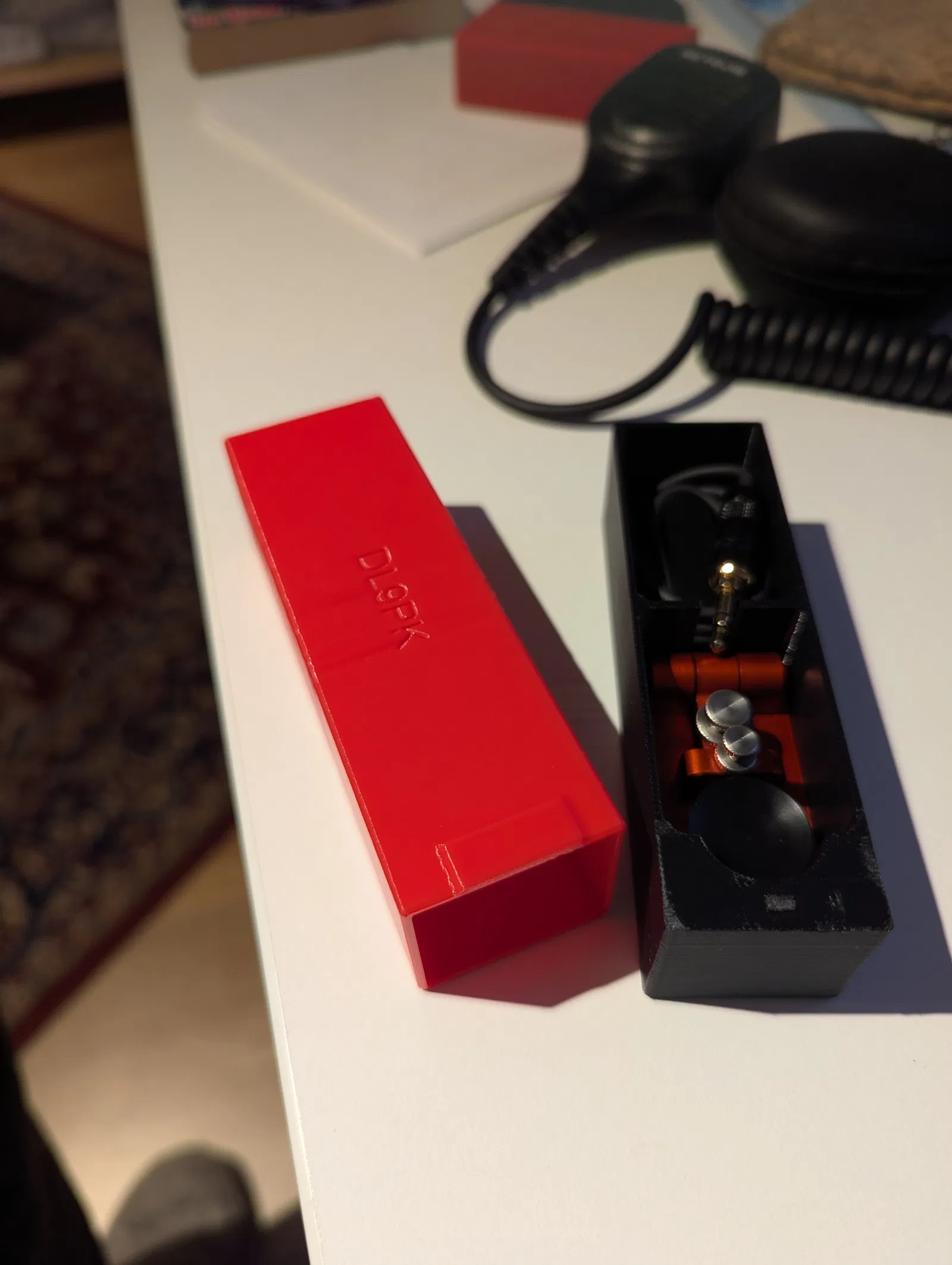 Holder dành cho BaMaTech mini straight key EHT-ii/EHT-2, có thêm phần gom dây vì cáp không tháo rời. Thiết kế cân đối chiều cao và độ siết dây, cần dũa tab để mở/đóng nắp mượt hơn.