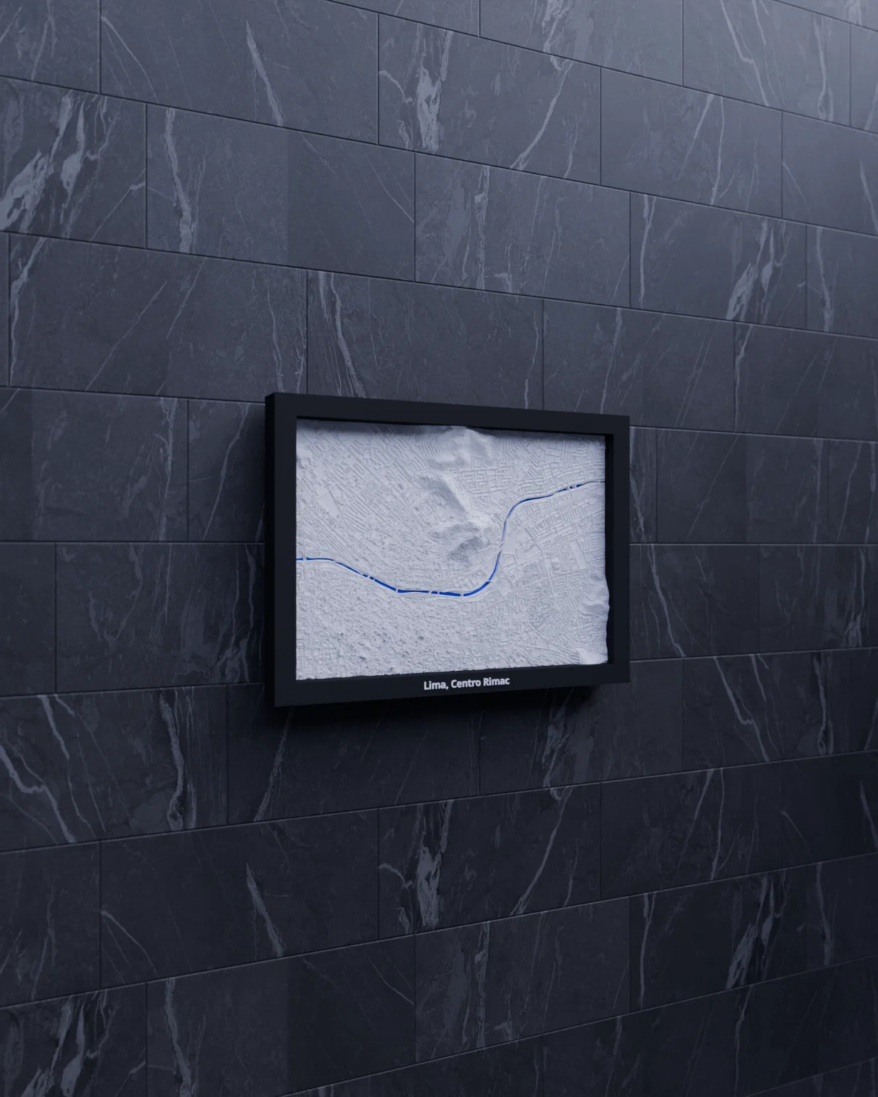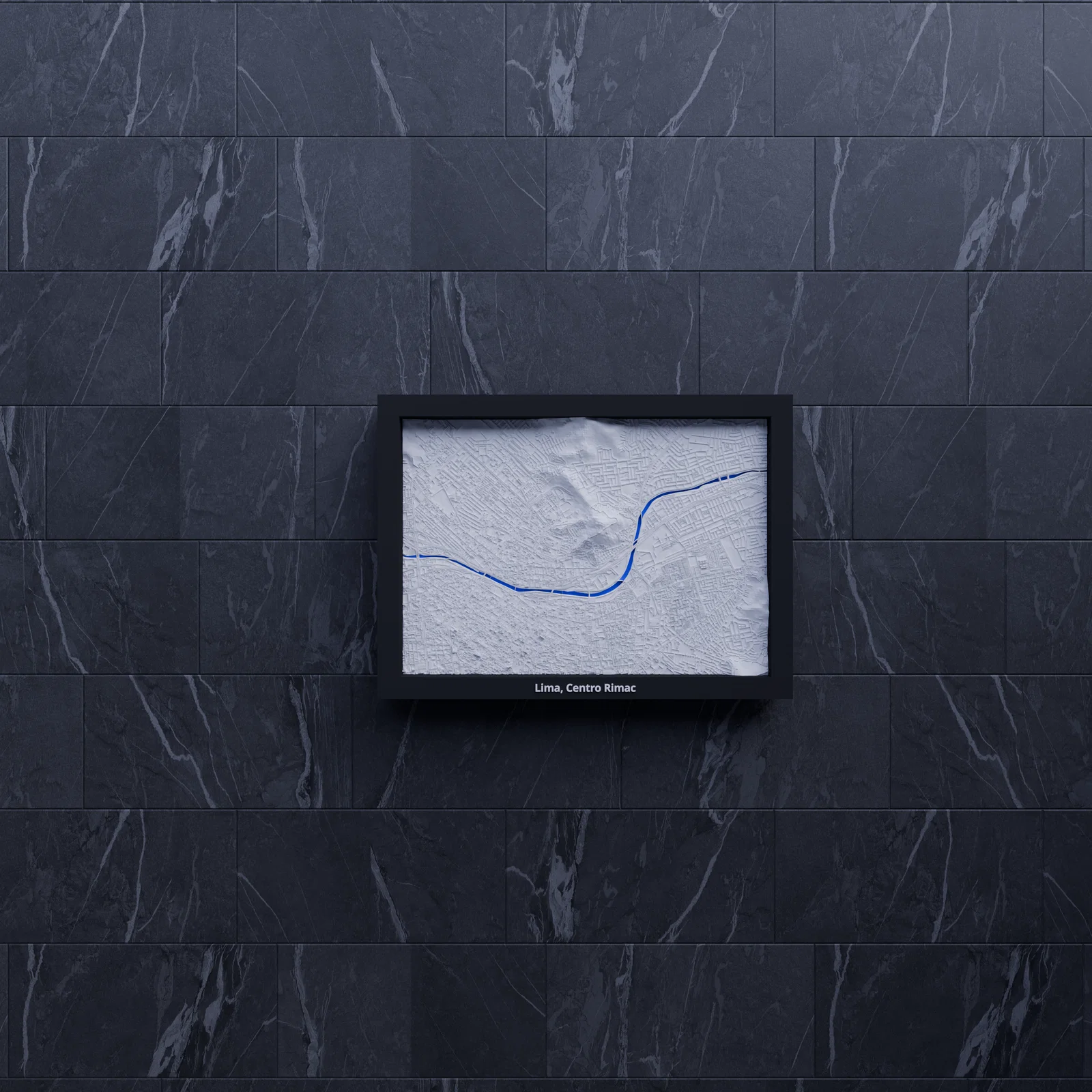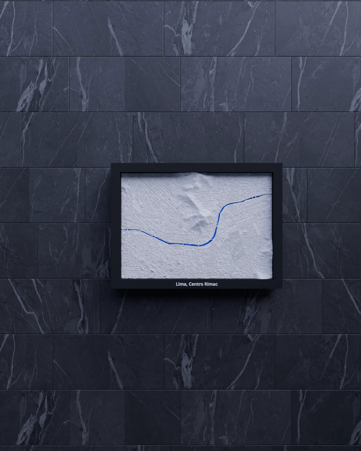 Miniature địa hình topographic 3D của Lima, Centro Rimac (Peru), dựng từ dữ liệu địa lý cho terrain chân thực. Thu nhỏ khu vực 5.553×3.867 km về kích thước 170.5×119.5 mm, kèm nhiều frame có lỗ treo.