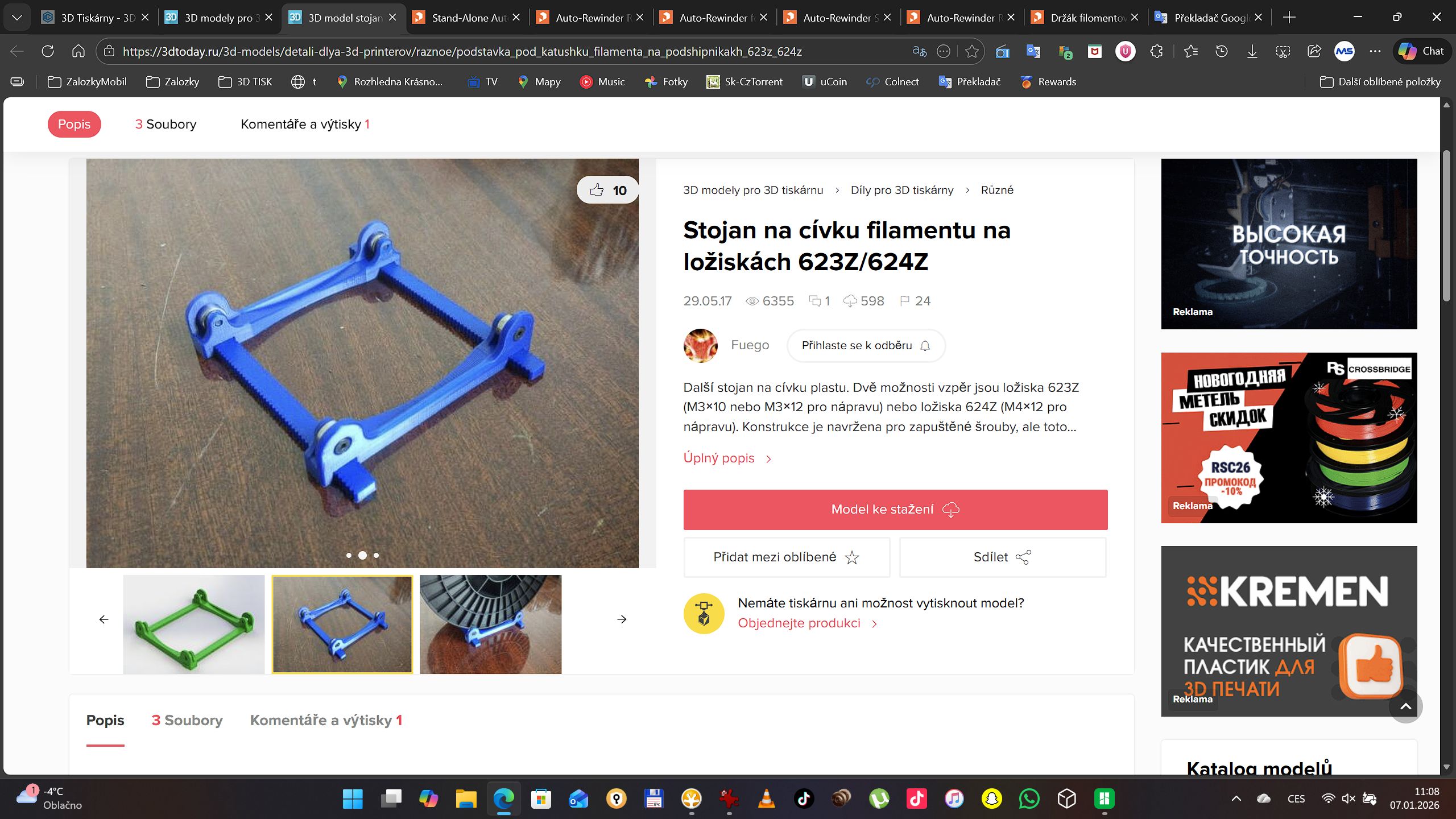 Mẫu giá đỡ cuộn filament dùng vòng bi 623Z-624Z, giúp cuộn quay mượt và ổn định khi in 3D. Phù hợp làm spool stand đơn giản cho setup in tại nhà.