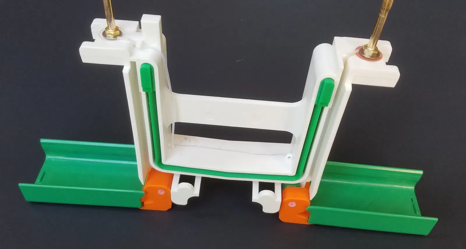 KHI CHƯA lắp glass plates, gập/đóng hai cánh (wings) về vị trí đóng rồi trượt chi tiết 3D vào từ phía dưới. Phần đáy của wing phải ngồi sát hoàn toàn trong rãnh (channel) của chi tiết 3D, nếu không thì chốt (pin) để giữ sẽ không luồn qua được. Khoảng 1mm cuối sẽ “bấm” (snap) vào đúng vị trí.
