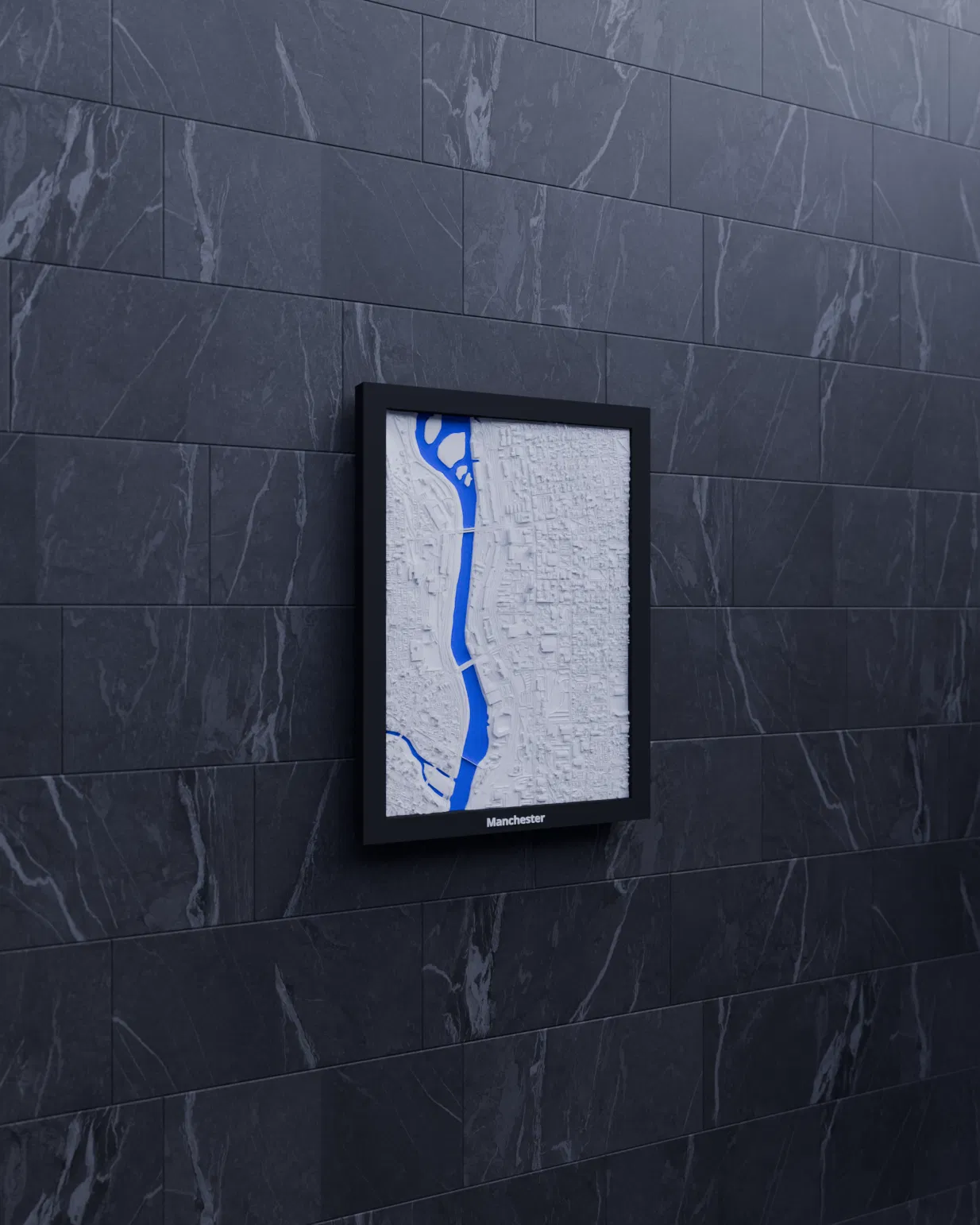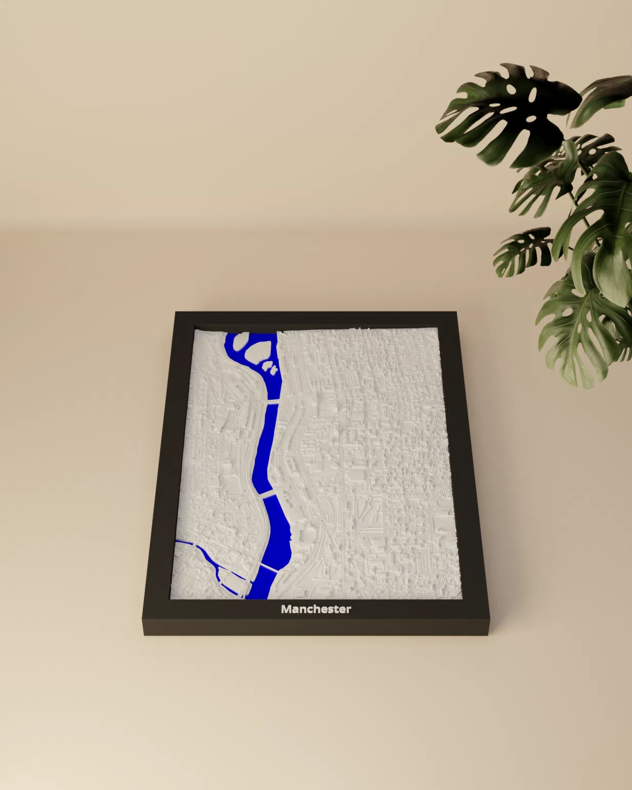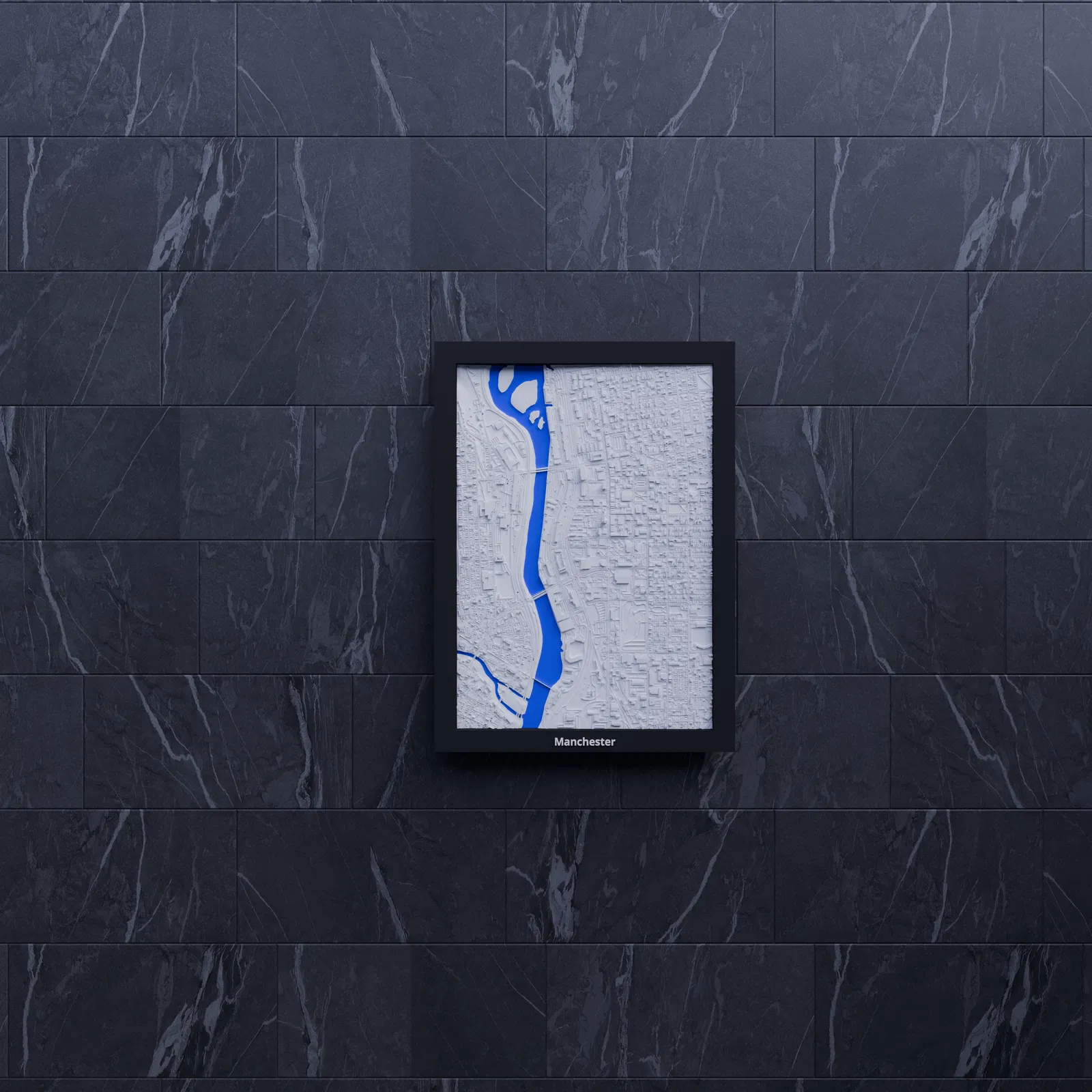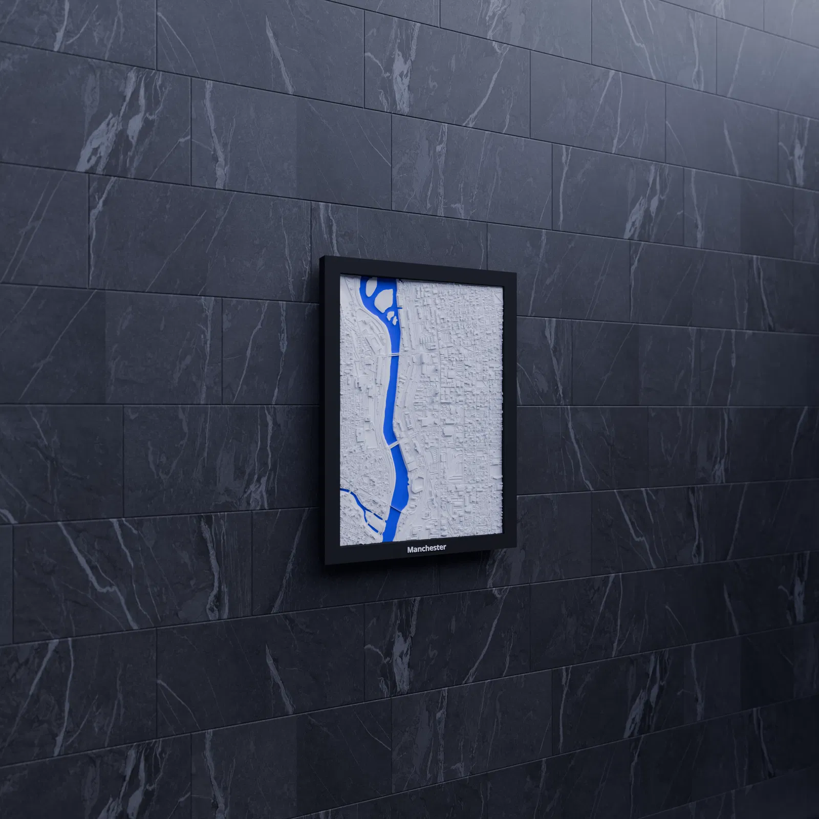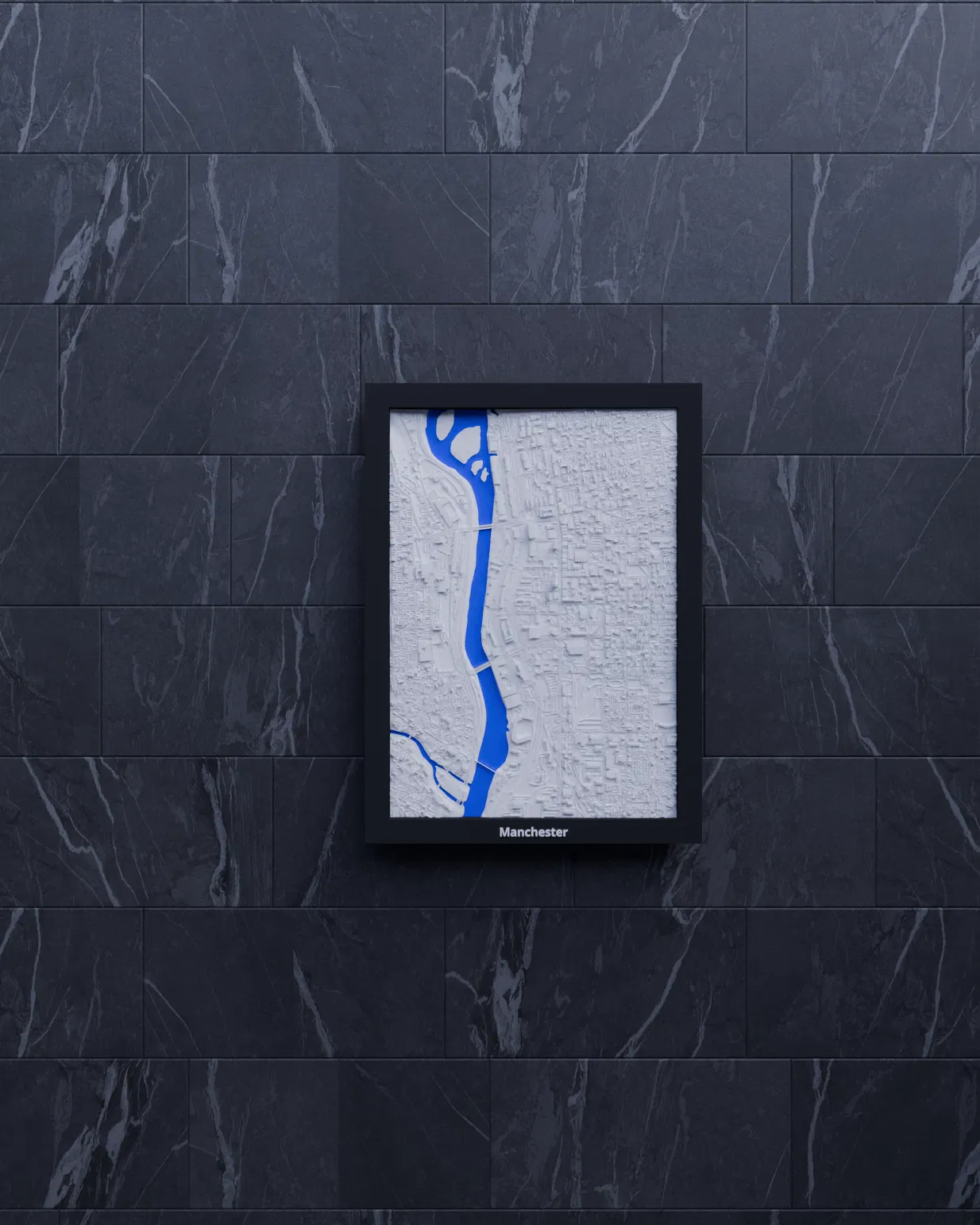 Tái hiện cảnh quan địa hình Manchester (Hoa Kỳ) dưới dạng mô hình thu nhỏ in 3D từ dữ liệu địa lý. Kèm nhiều tùy chọn khung, phù hợp trưng bày, học tập, hoặc làm quà lưu niệm.