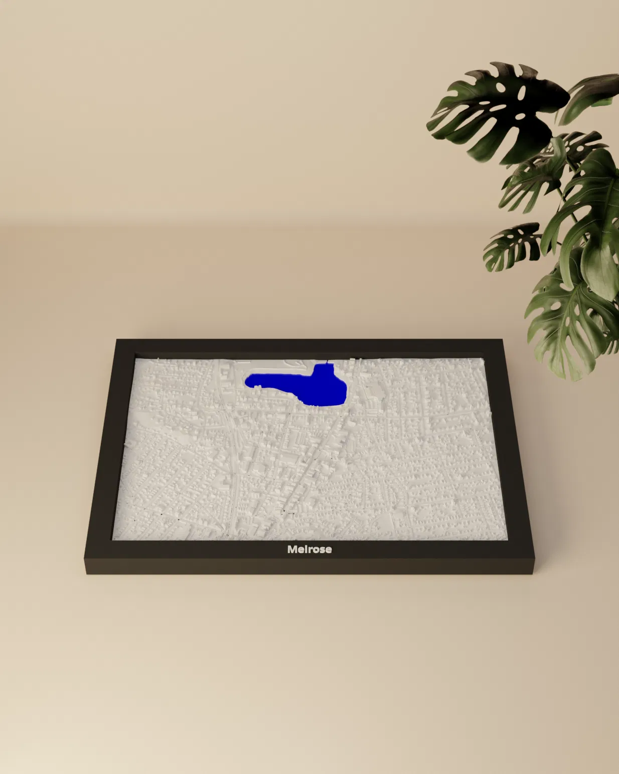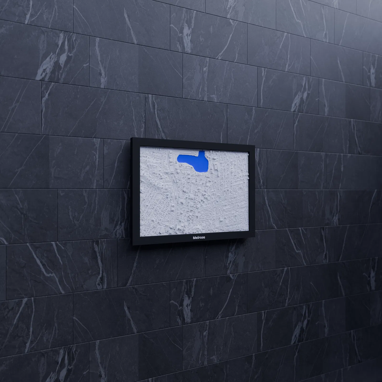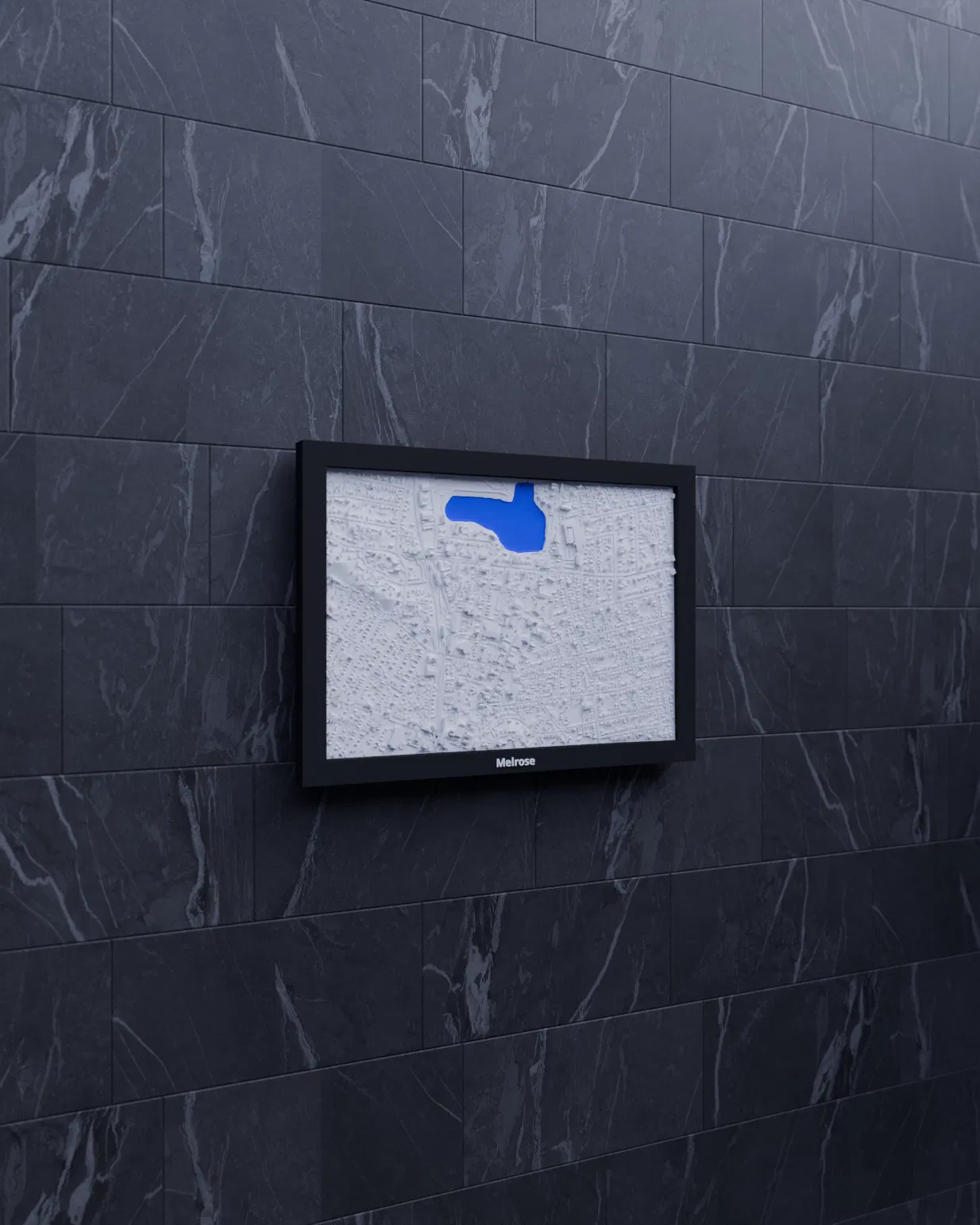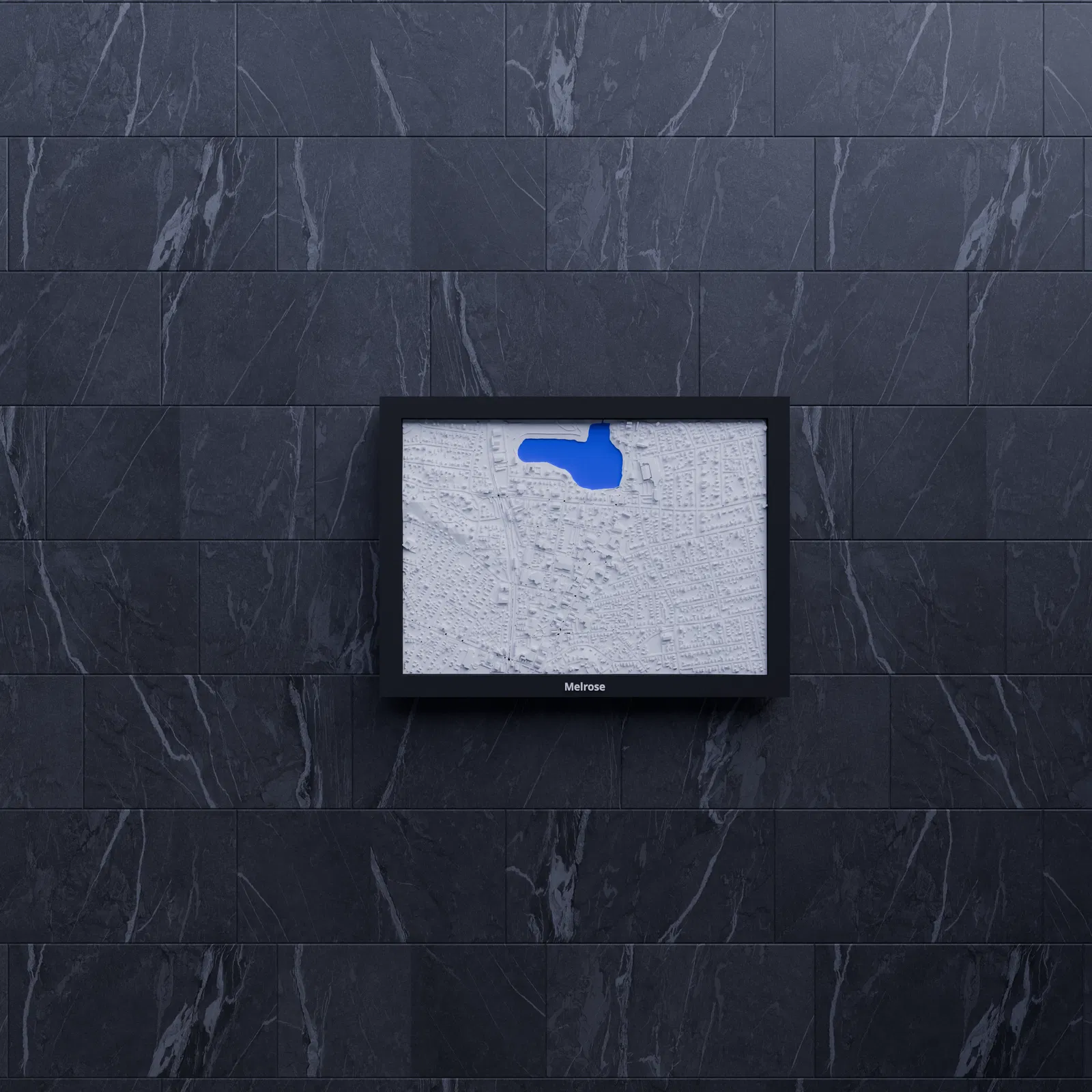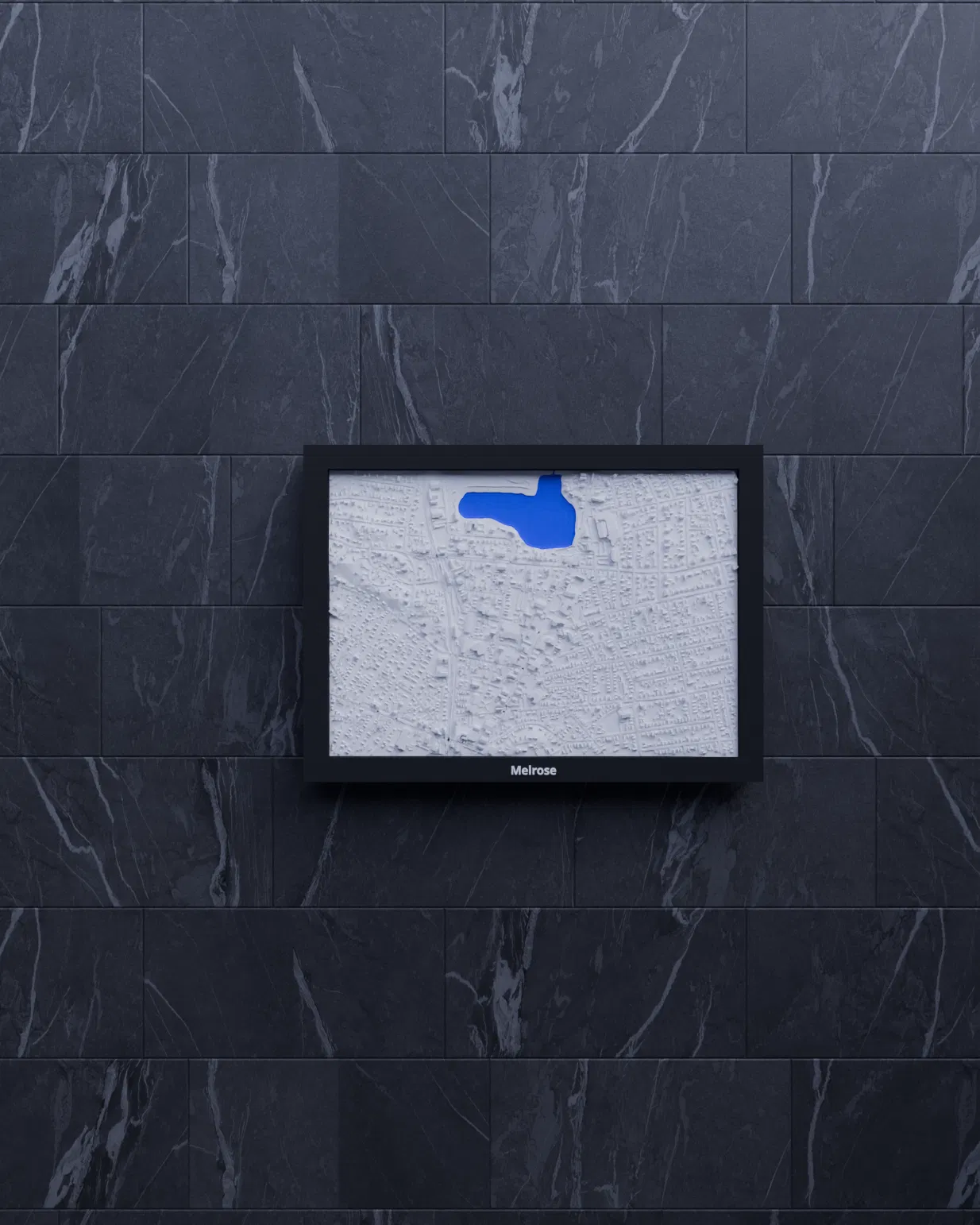 Miniature địa hình topographic của Melrose (Hoa Kỳ), dựng từ dữ liệu địa lý để thể hiện terrain chân thật. Kích thước in 170.5 × 119.5 mm, có nhiều frame kèm lỗ treo, phù hợp trang trí hoặc học tập.