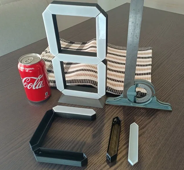 Bộ số seven segment GIANT dạng module, cao 246mm, ánh sáng đều nhờ dải LED chạy suốt segment. In nhiều mảnh rồi bấm khớp, có lens diffuser, đi dây xuyên, đế tùy chọn; không cần support.