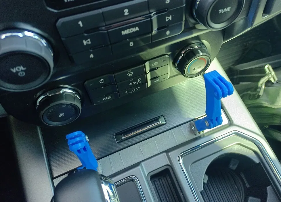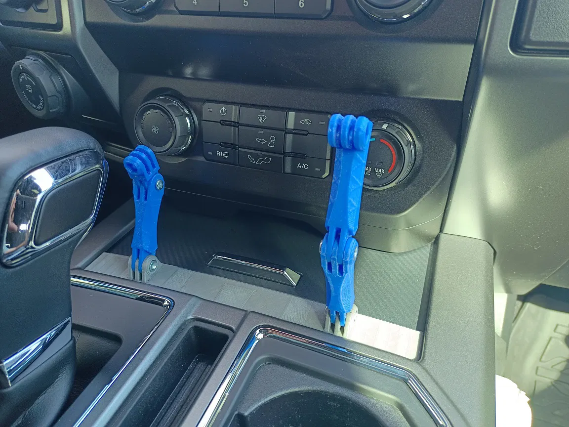 Modular F150 Mount dùng tán và bu-lông M5, có bản mount đơn và mount đôi. Có link parts/pieces tham khảo trên Thingiverse và một mẫu tablet holder dùng chung mount này.