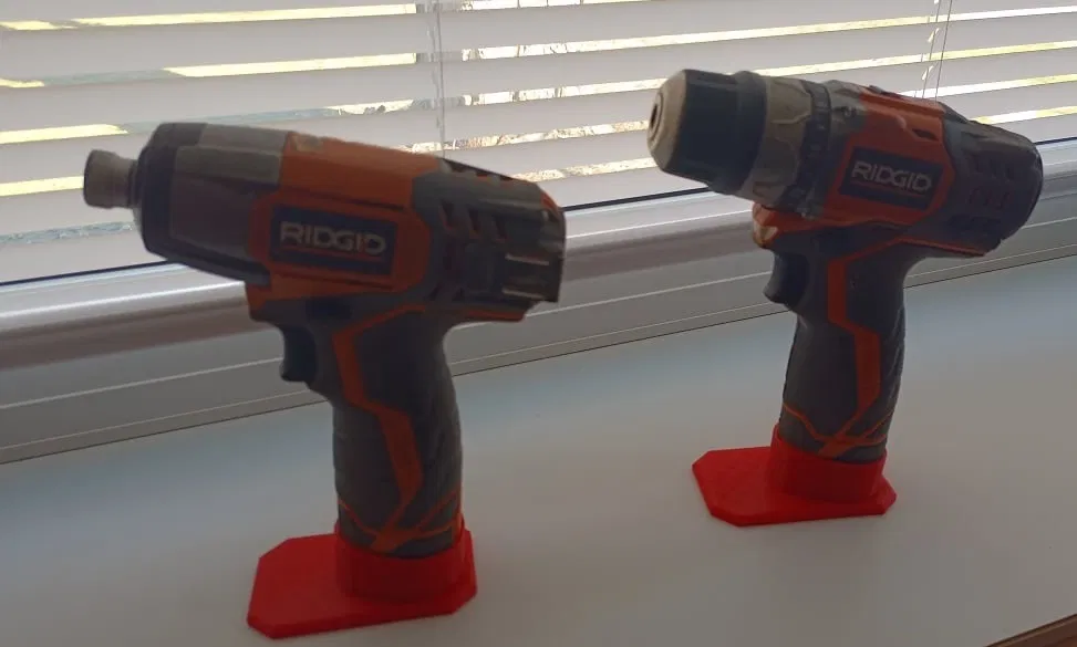 Chân đế giúp dụng cụ Ridgid AEG 12V đứng thẳng bằng cách chụp trực tiếp lên pin. Tương thích pin compact 1.5Ah và 2.0Ah. In không cần raft hay support, infill 20%, độ phân giải 200.