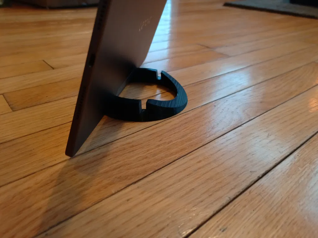 Giá đỡ tablet/điện thoại dạng vòng rất đơn giản, khe đặt sâu 7mm cho thiết bị mỏng. Có 2 góc 5° (gần dựng đứng) và 17°, dùng ổn cho tablet tới 13". Lấy cảm hứng từ Thingiverse.