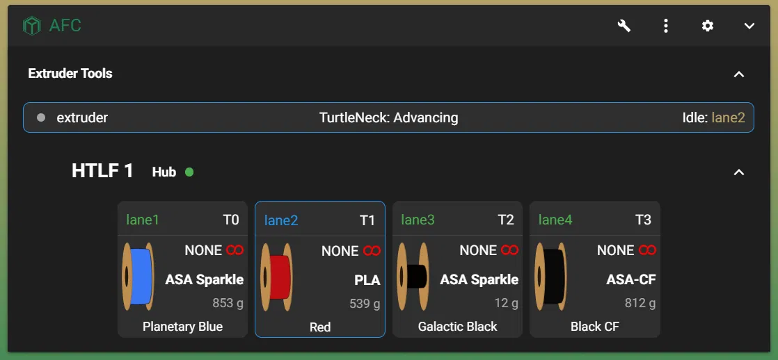 Để hiệu quả nhất, nên dùng kèm AFC Klipper Add On — một Klipper plug-in cho các hệ multi color đời mới. Code tích hợp cho Mainsail với UI gọn gàng, không gây rối mắt cho AFC nằm ở đây .. hoặc bạn có thể gửi yêu cầu serial trong ArmoredTurtle Discord để được cấp quyền dùng bản pre-compiled và lấy một số định danh riêng cho HTLF của bạn!