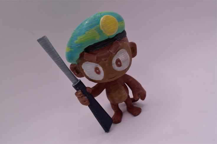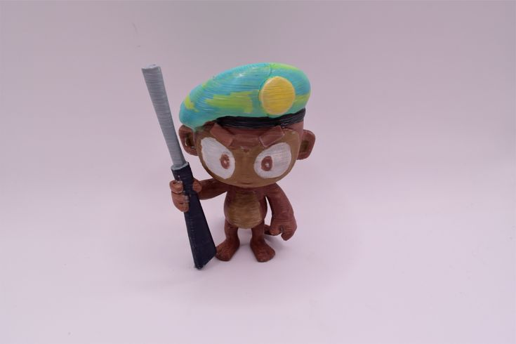 Figurine Sniper Monkey lấy cảm hứng từ BTD 6, phong cách cartoon với mắt to và mũ đặc trưng. Dáng đứng vững, chi tiết rõ nên in dễ trên thiết lập cơ bản; phù hợp trang trí bàn/kệ và sơn sau khi in.