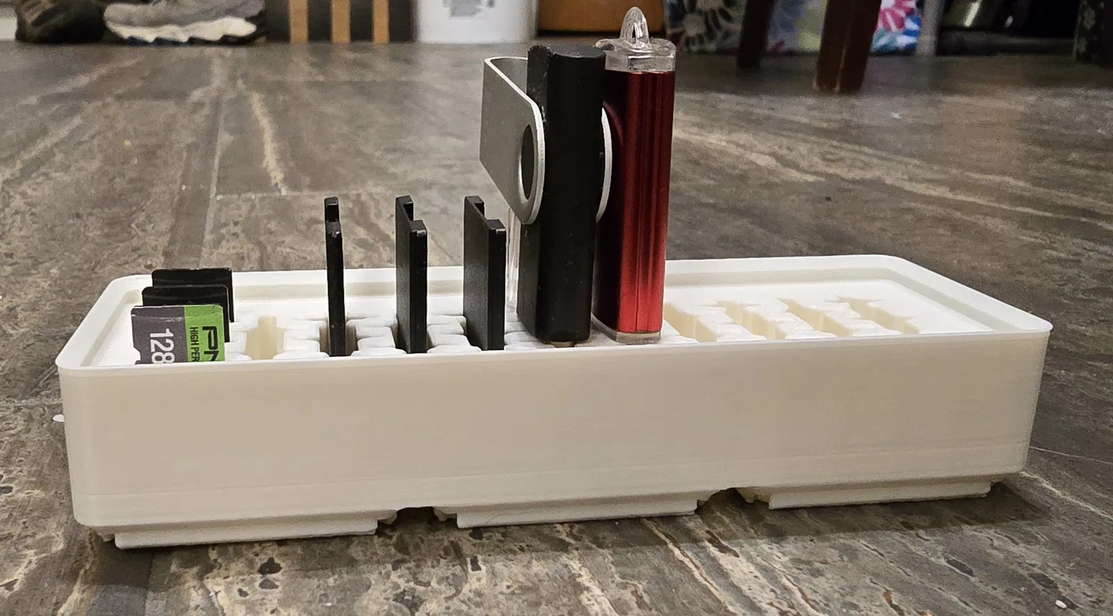 Mẫu remix từ @NeoGAN\_3656609, dùng đế gridfinity re-refined của @Roboter32\_1157314 để làm khay giữ thẻ SD/microSD và đầu USB-A/USB-C gọn gàng, dễ in. Nên in adaptive layer height để fillet đẹp.
