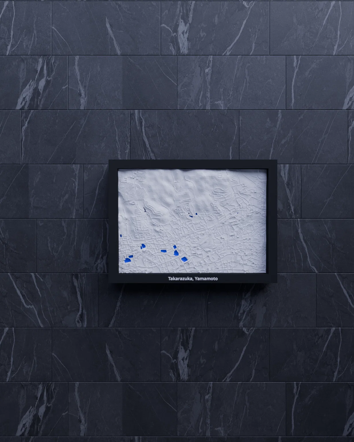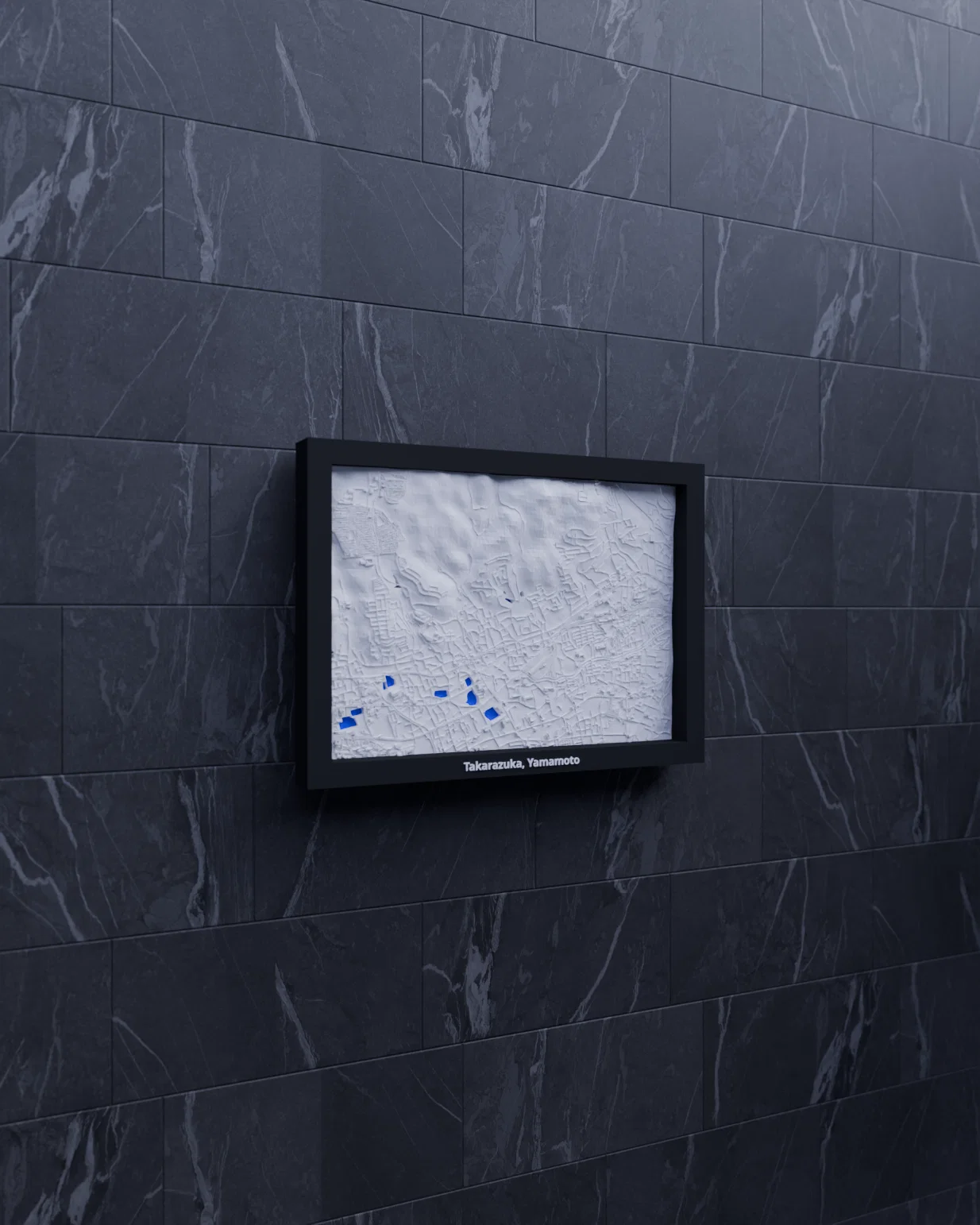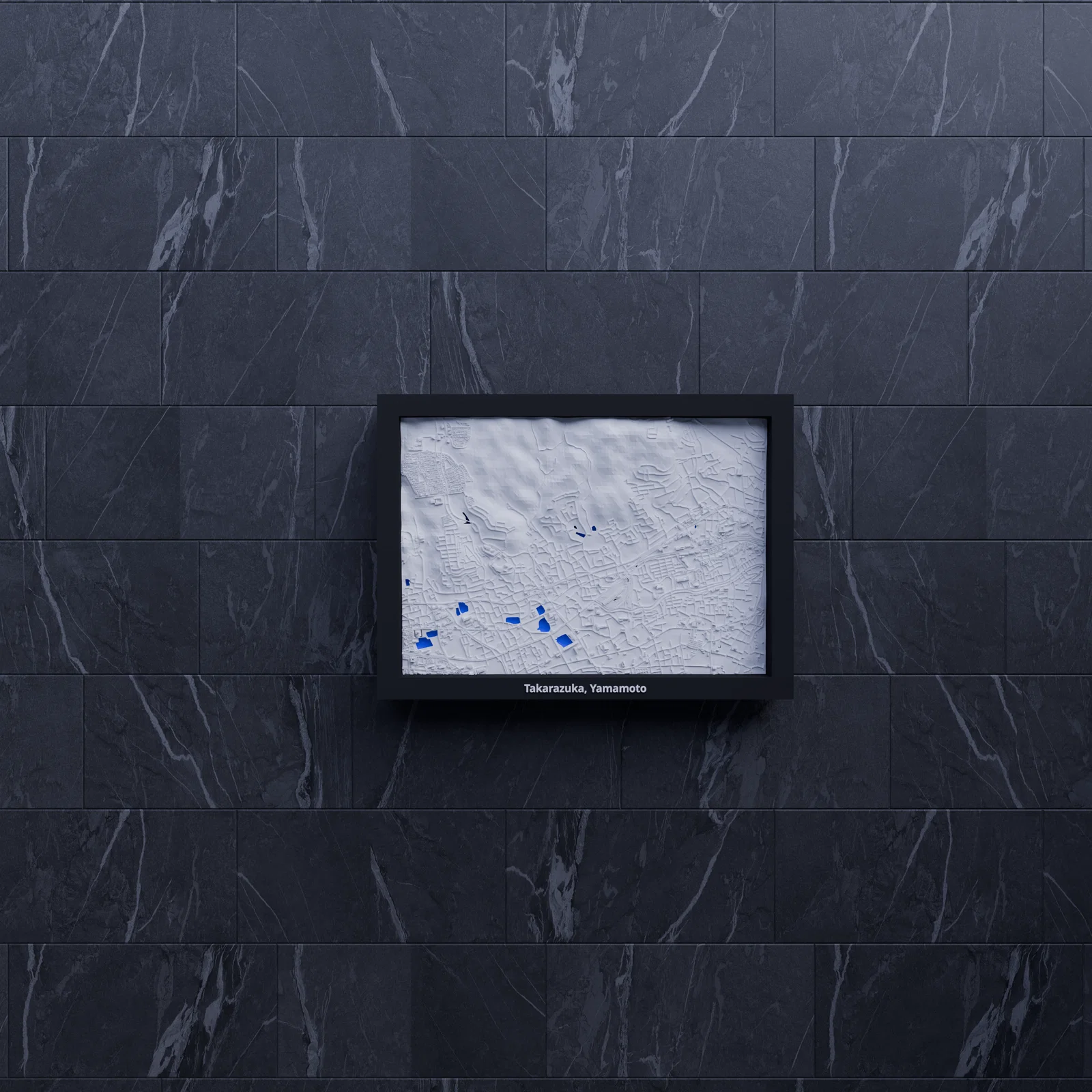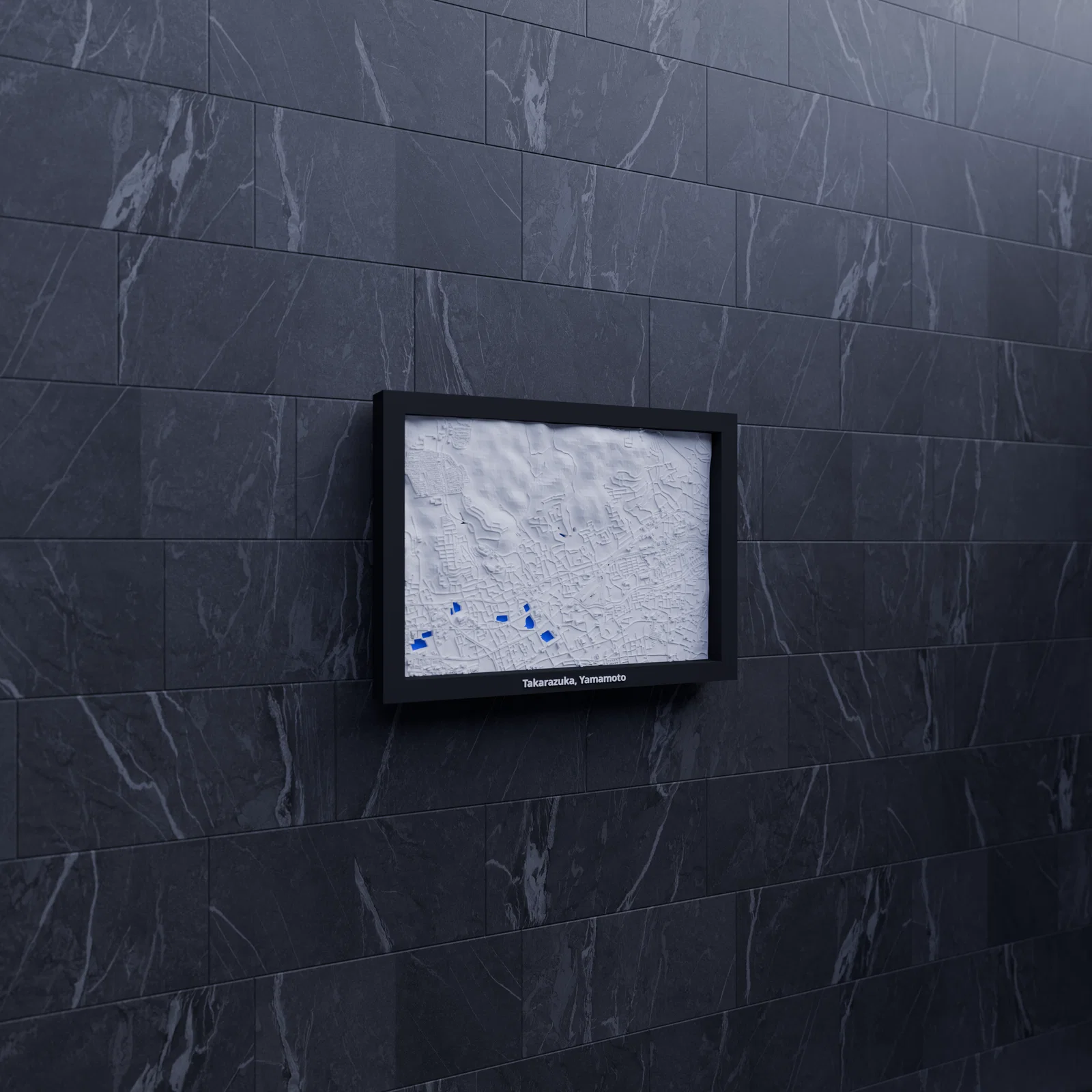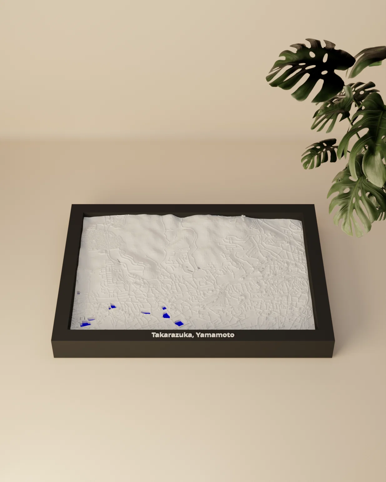 Mô hình topographic miniature 3D tái hiện khu vực Takarazuka, Yamamoto (Nhật Bản) từ dữ liệu địa lý. Kích thước 170.5×119.5 mm, tỉ lệ ~18632:1, kèm nhiều lựa chọn khung có lỗ treo để trưng bày.