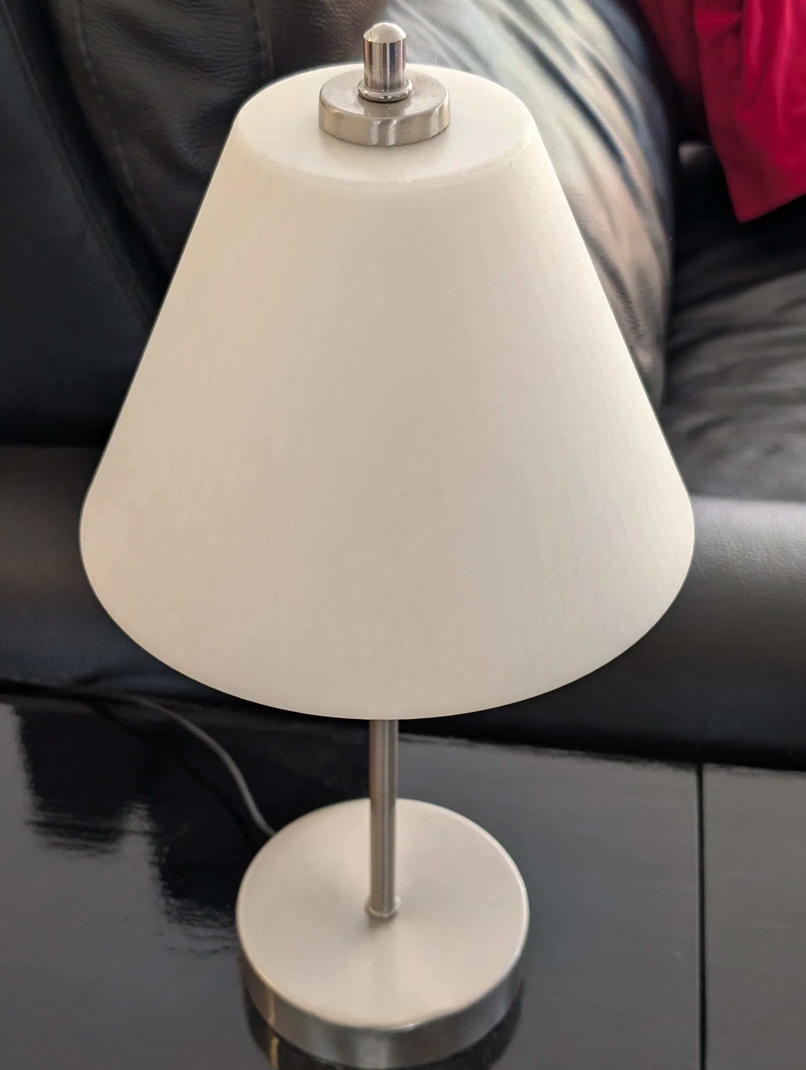 Cái chụp đèn thủy tinh của một cái đèn bàn nhỏ bị bể nên mình thấy đây là dự án đầu tiên quá hợp để bắt đầu với con máy in 3D mới. Ban đầu mình dựng một thiết kế đơn giản trong Fusion 360 để làm quen các thao tác cơ bản. Sau đó xuất qua slicer và dùng các file test để canh chỉnh settings. In ra xong nhìn rất ổn, đến mức vợ mình còn muốn thay luôn cả cái chụp đèn còn nguyên cái còn lại.