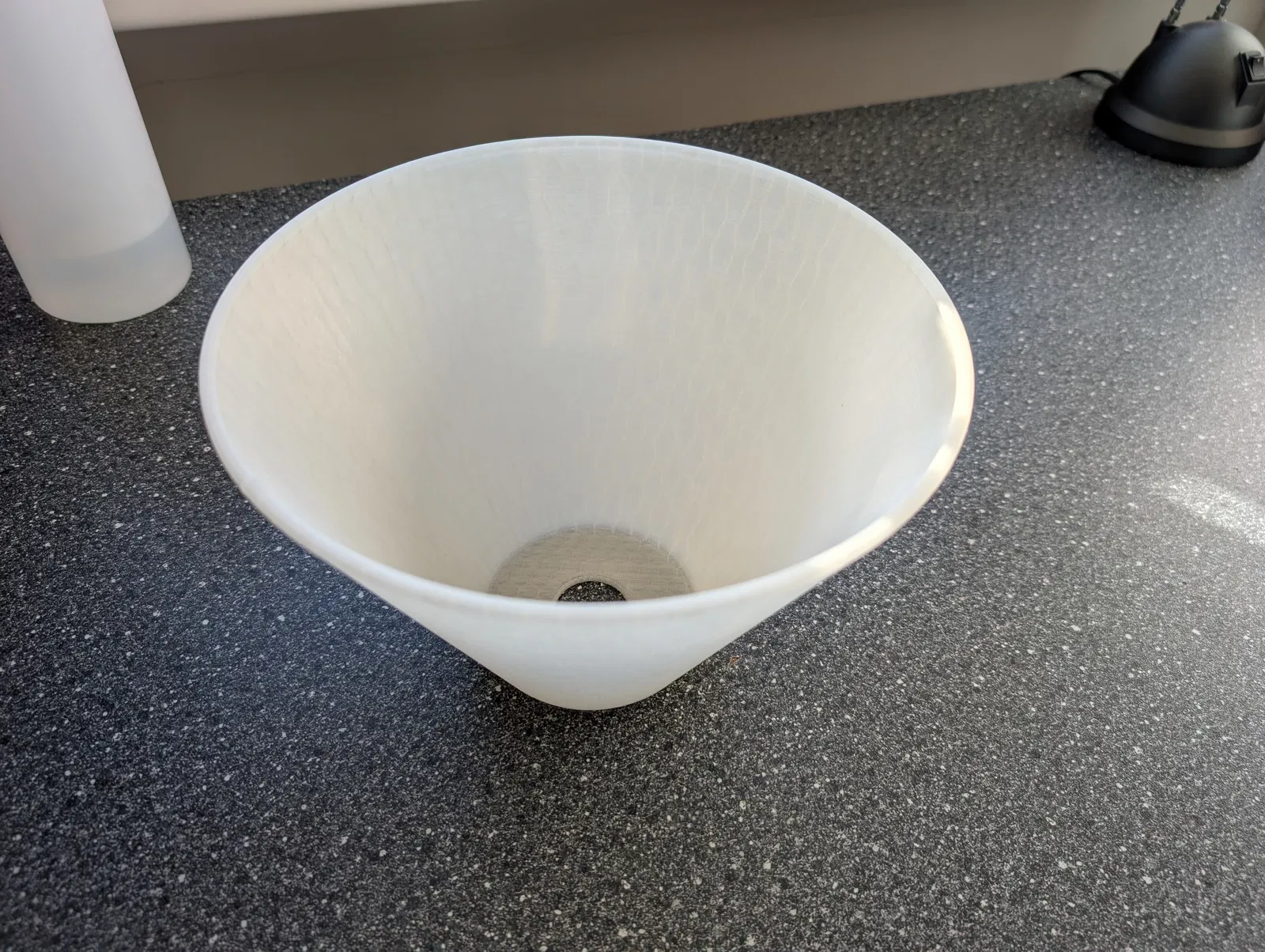 Mẫu chụp đèn đơn giản cho bóng E14 type B, lỗ mở 30mm. Thiết kế dễ in, phù hợp làm dự án đầu tiên với máy in 3D. In bằng Prusament PLA Natural, nhìn thấy honeycomb infill; lưu ý có đường seam.