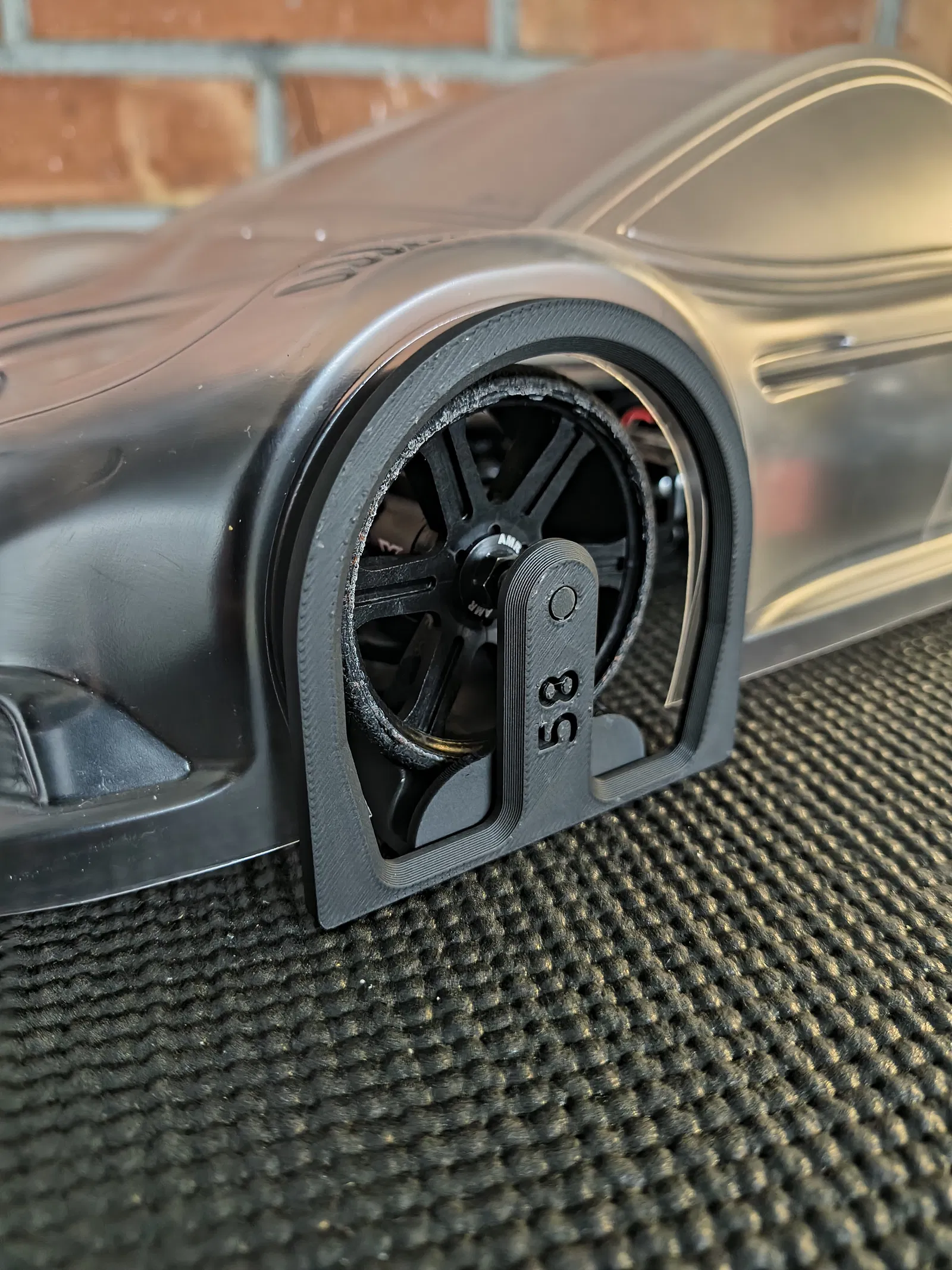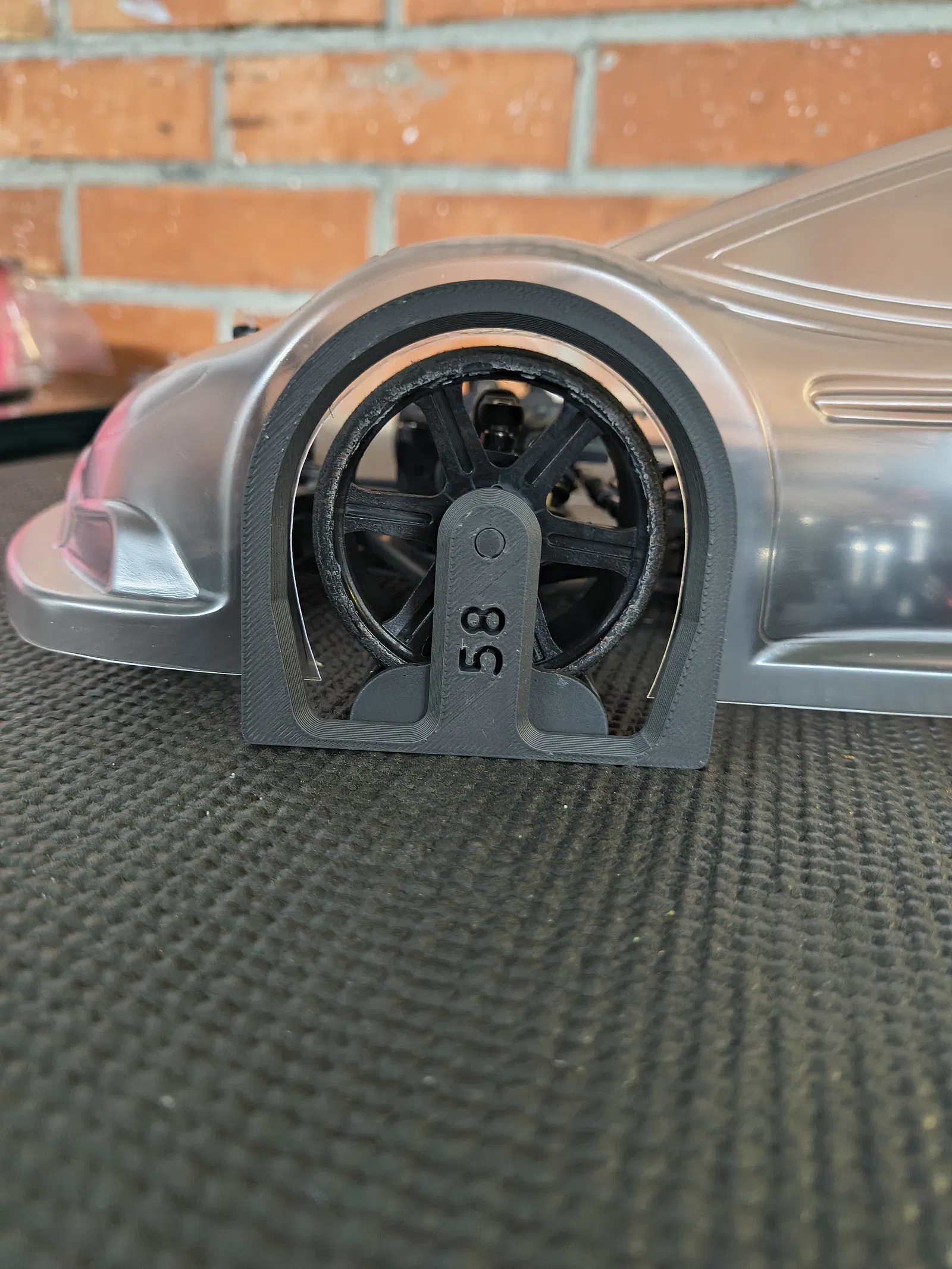 Mẫu dưỡng tạo wheel arch 58mm cho touring car dùng foam tire, dựa theo Hudy professional wheel arch marker nhưng thu nhỏ. Thiết kế để dùng hardware của kit Hudy (axle spacer, nut) và có thêm reference stand để kê bánh.