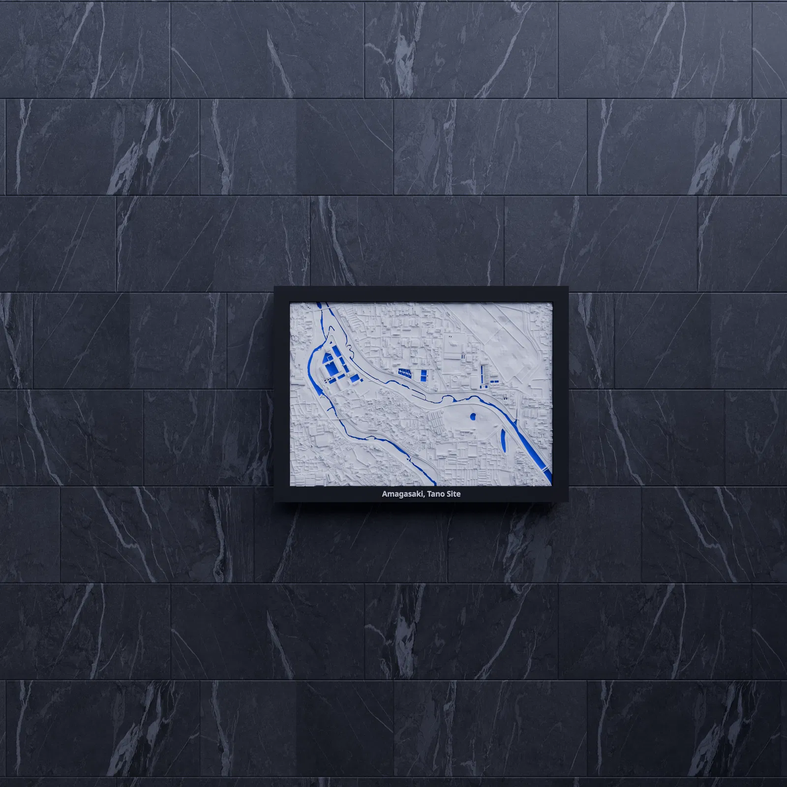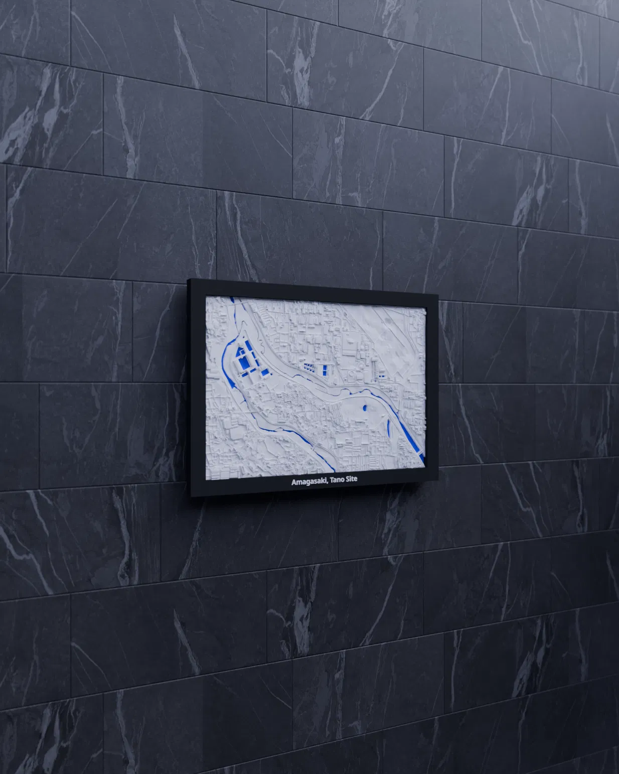 Mô hình thu nhỏ địa hình Amagasaki, Tano Site (Nhật Bản) dựng từ dữ liệu địa lý, thu nhỏ từ 2.859×1.995 km xuống 170.5×119.5 mm. Có nhiều frame kèm lỗ treo, phù hợp trưng bày, học tập và trang trí.