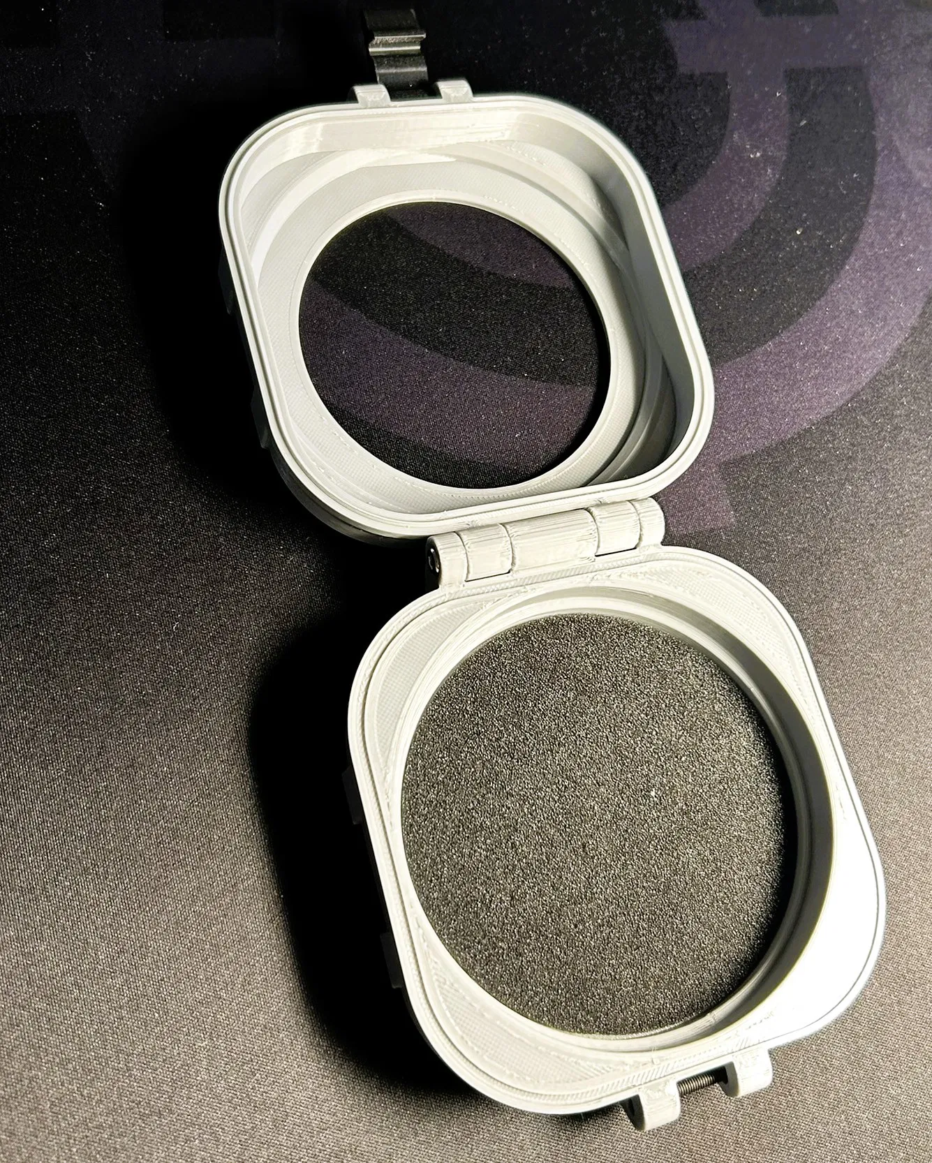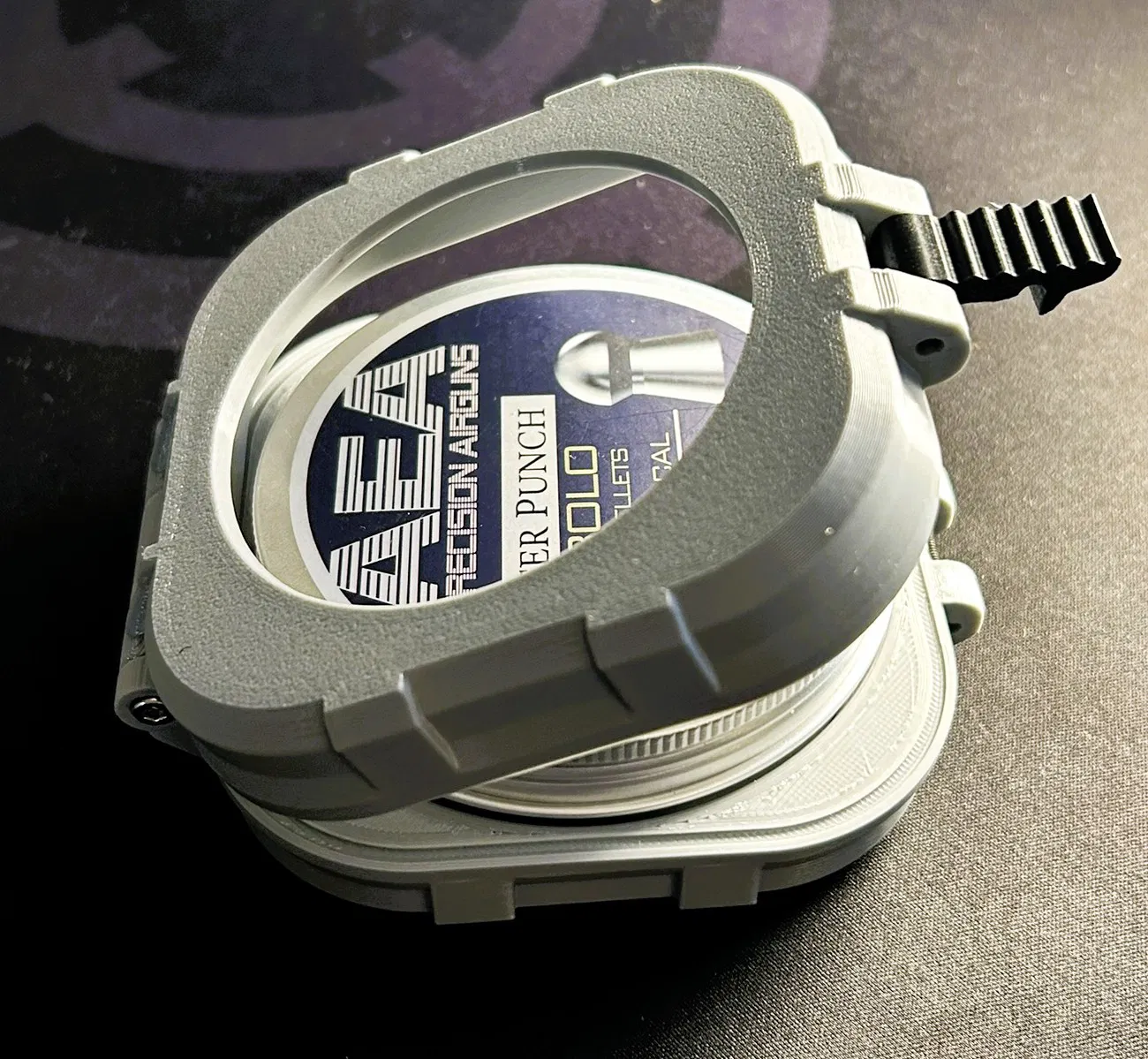 Hộp bảo vệ bền chắc cho lon pellet súng hơi (airgun), phù hợp lon AEA hoặc tương tự loại 500 viên. Vừa kích thước Ø87mm x cao 27mm. Đóng nắp để vận chuyển vẫn nhìn thấy bên trong; mở nắp dùng như giá để bàn.