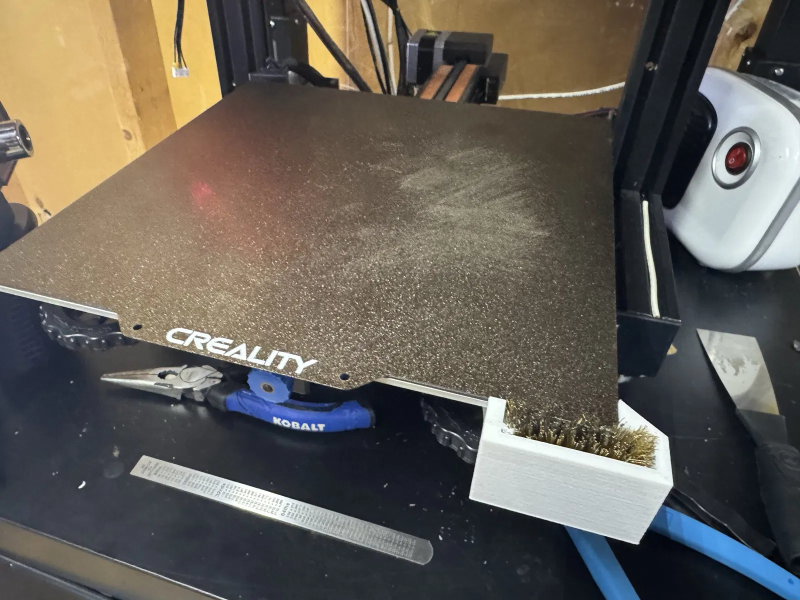 Bản remix từ Ender 3 Nozzle Wipe Attachment của Legend. Đồng thời đã chỉnh lại để bàn chải chỉ nhô lên khoảng 2mm so với build plate, nhằm giảm tối đa vấn đề lệch nozzle so với probe trong lúc bed leveling và meshing.