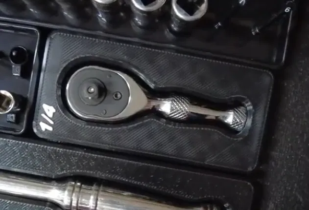 Bộ khay/holder đựng Duratech Stubby Rachet cho 2 cỡ 1/4" và 3/8", có vị trí gắn nam châm 3/8". Kèm video hướng dẫn cách tự thiết kế holder và link mua nam châm + rachet.