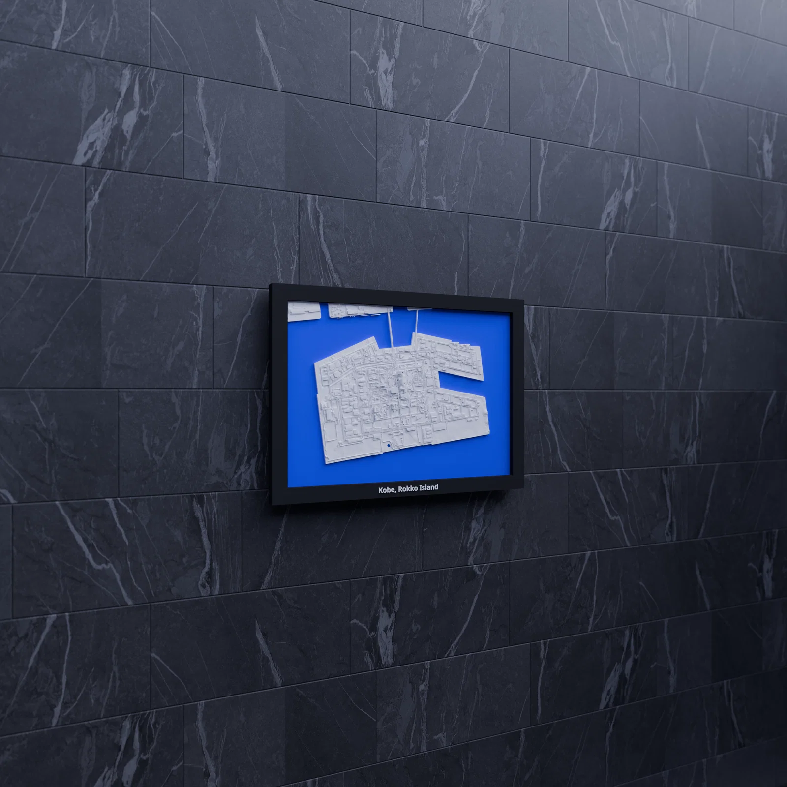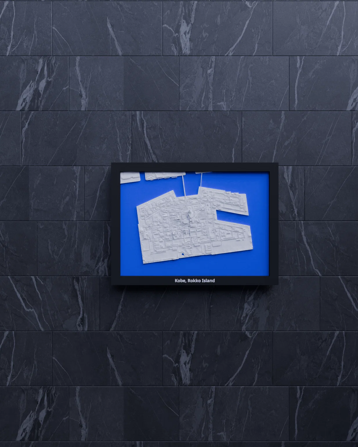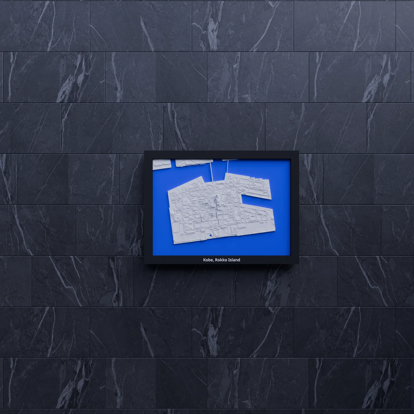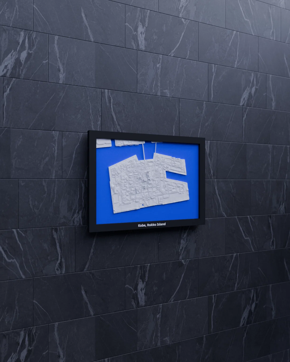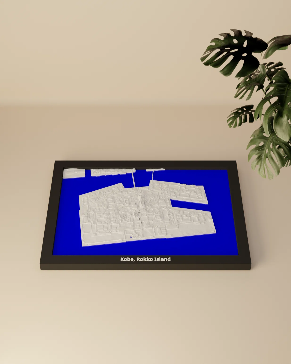 Mô hình topo 3D tái hiện Kobe, Rokko Island (Nhật Bản) từ dữ liệu địa lý, thu nhỏ còn 170.5 x 119.5 mm (tỉ lệ ~26085:1). Có nhiều frame kèm lỗ treo, phù hợp trưng bày, học tập, trang trí.