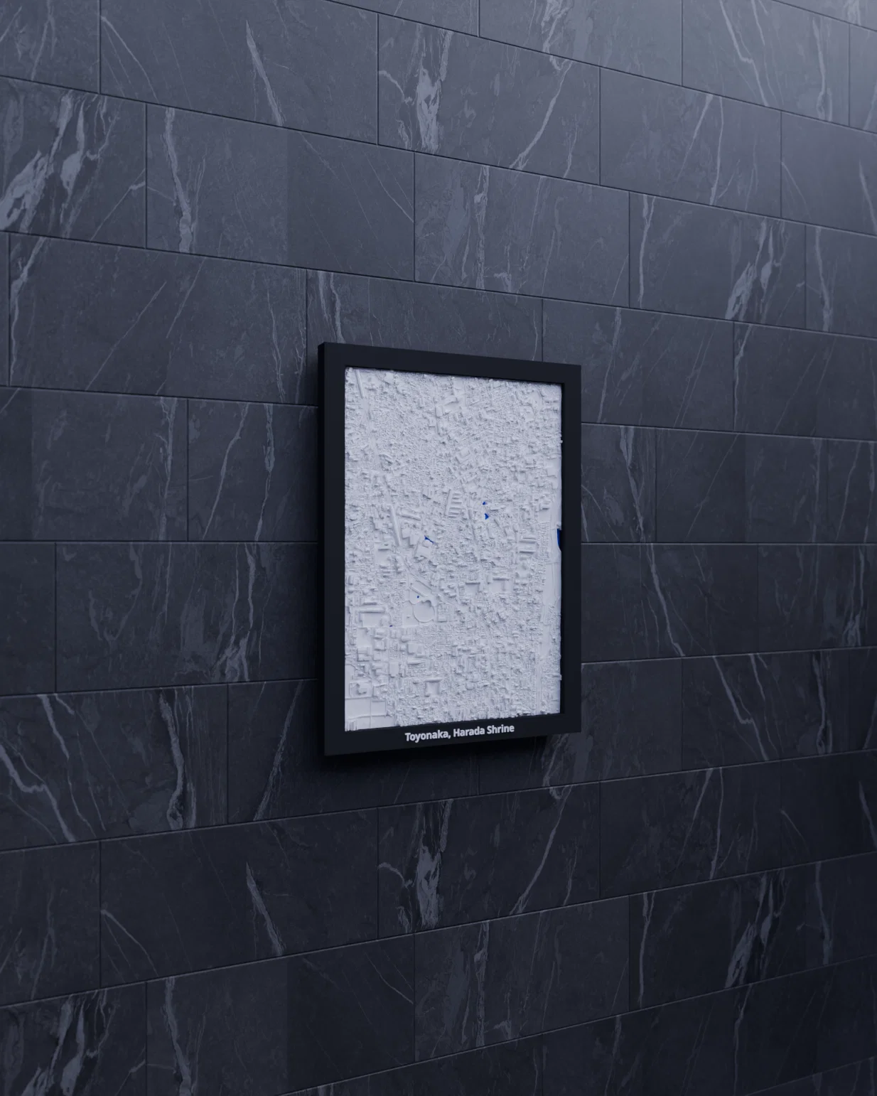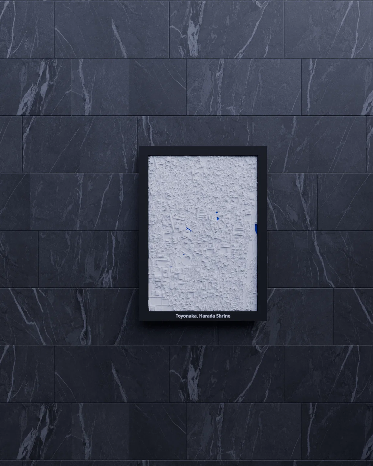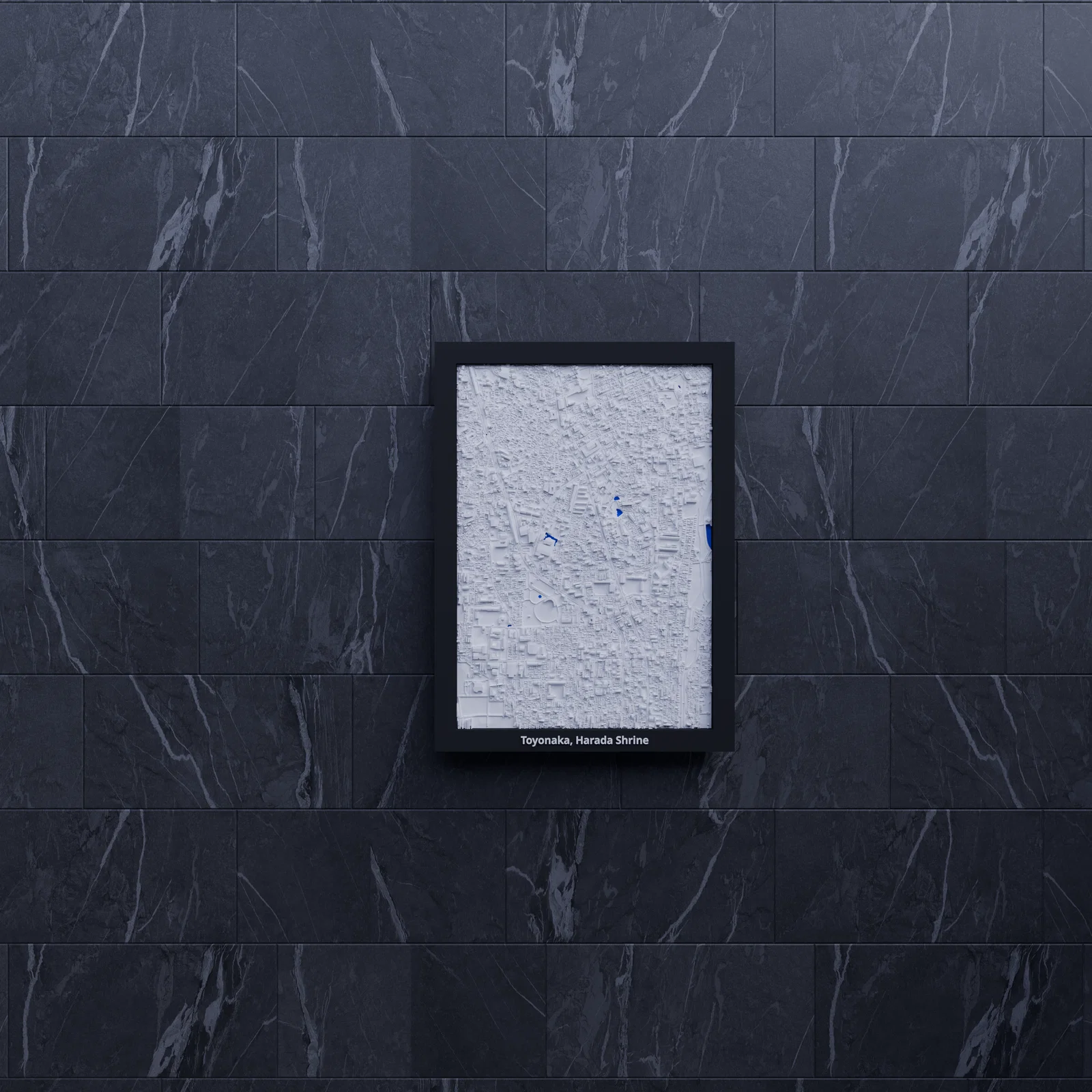 Mô hình địa hình (topographic) thu nhỏ của Toyonaka, Harada Shrine (Nhật Bản), dựng từ dữ liệu địa lý. Kích thước in 119.5 × 170.5 mm, có nhiều lựa chọn frame kèm lỗ treo, phù hợp trưng bày hoặc làm quà tặng.