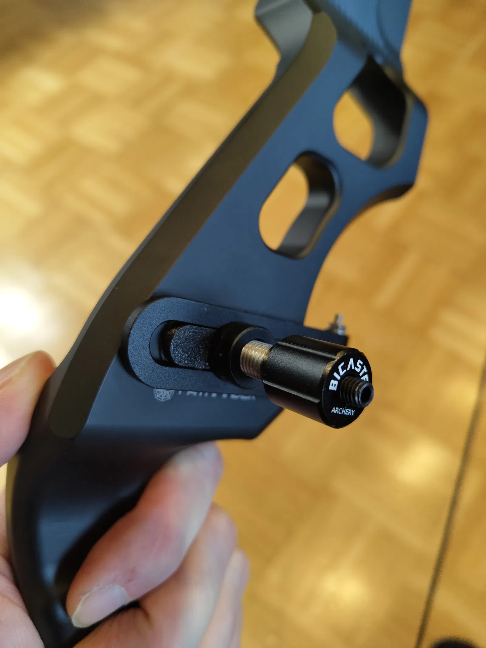 Mình tận dụng hai lỗ mà Mybo đã tích hợp sẵn để thêm một “shelf” lên cây cung, rồi thiết kế một chi tiết nằm bên trong arrow-rest để hạn chế việc bị xoay.