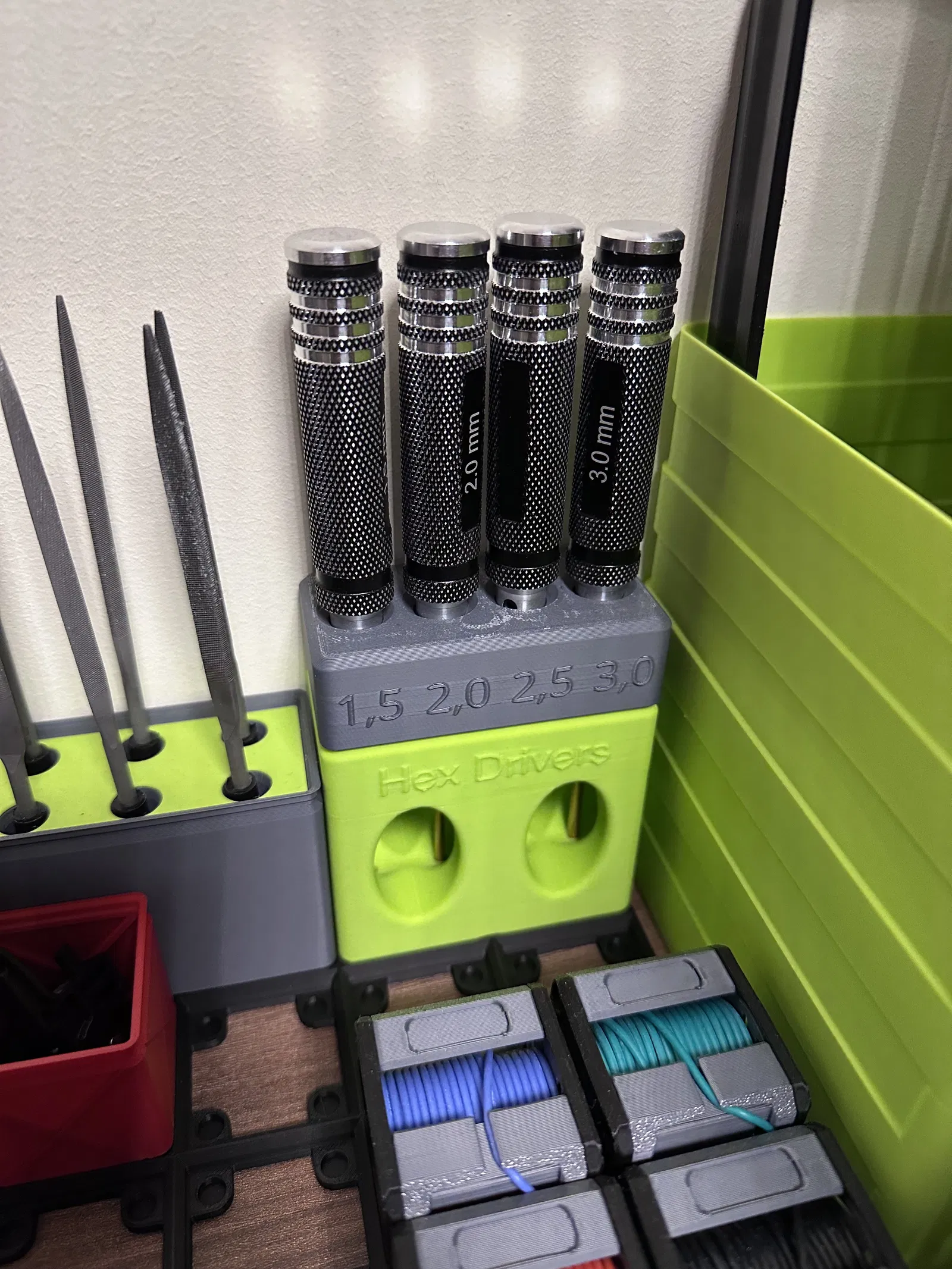 Phần mở rộng cho Gridfinity 2x1 hex driver stand, làm ra vì kích thước không khớp với bộ hex drivers thực tế. Có thêm labels để dễ nhận biết. Khuyến nghị in top side down.
