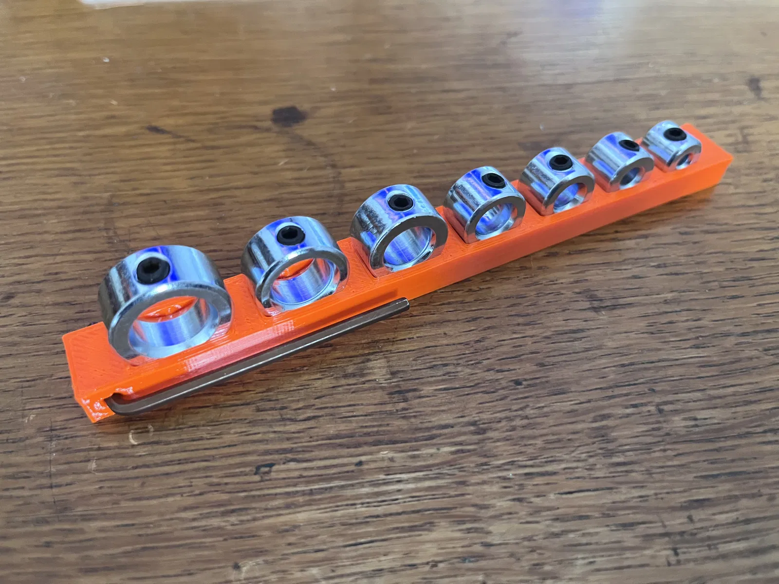 Giá đỡ low-profile cho bộ drill stop set của Harbor Freight, giữ các vòng chặn mũi khoan bằng ma sát cho gọn gàng, dễ lấy. Có kèm holder riêng cho đầu allen (lục giác) đi kèm.